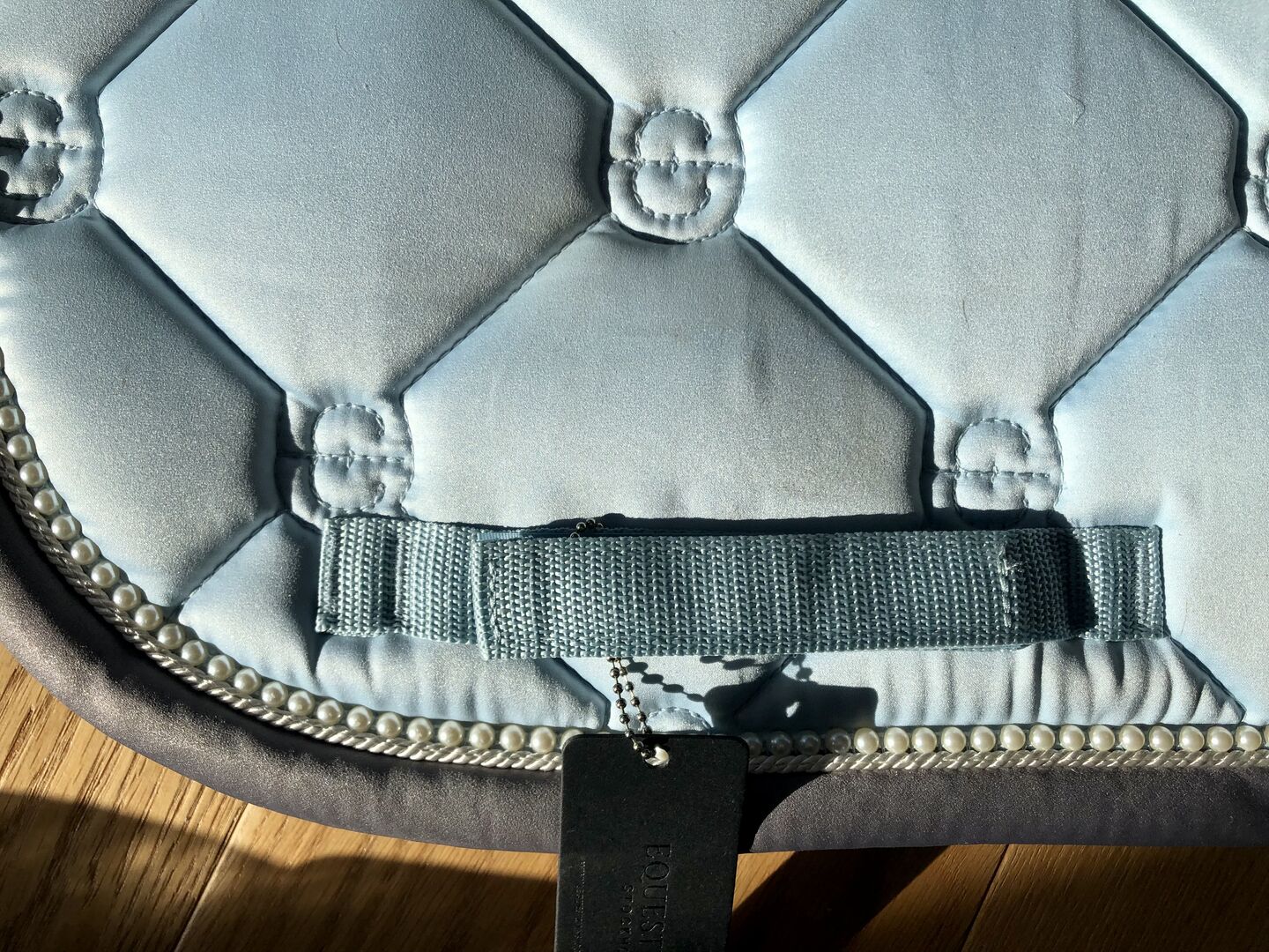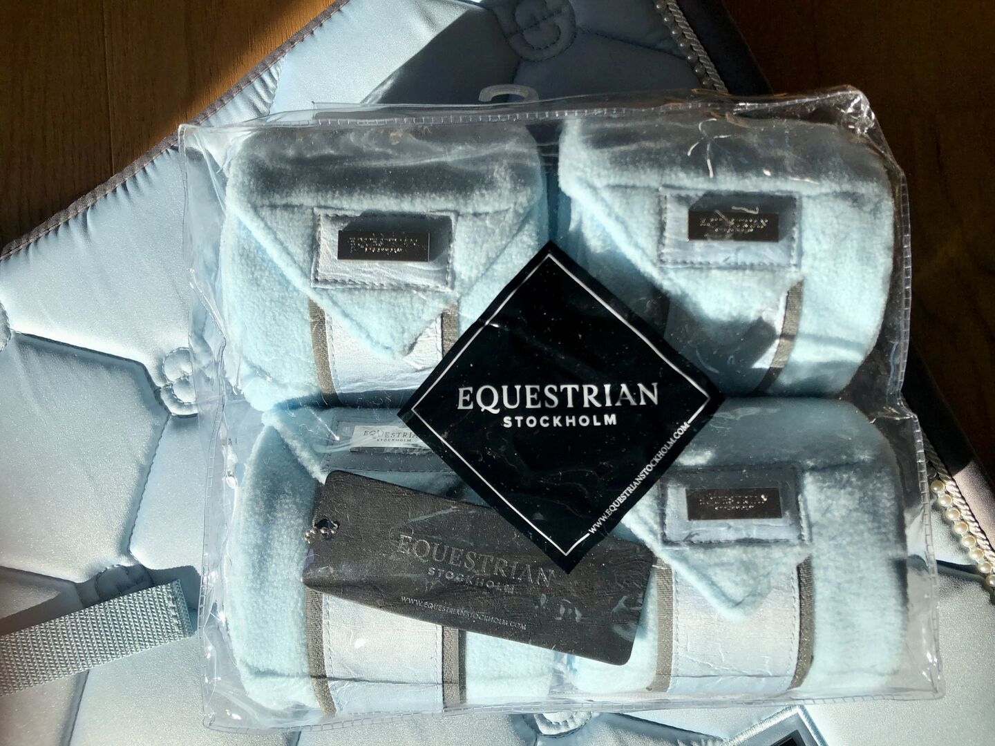 Equestrian Stockholm Ice Blue Saddle Pad Bandages Full Eskadron - I sell here an Equestrian Stockholm set in the color Ice Blue. - A beautiful dressage saddle pad in a light blue with gray details. Exclusive details with pearls and in Silver. Combines well thanks to the gray details. The inner material of the saddle pad is extra quick drying and in a dark gray color and the outer material is shiny and stain resistant and has beautiful silver details. and a pattern with the logo of Equestrian Stockholm. Lay for trial once on the horse RRP 85,00 €