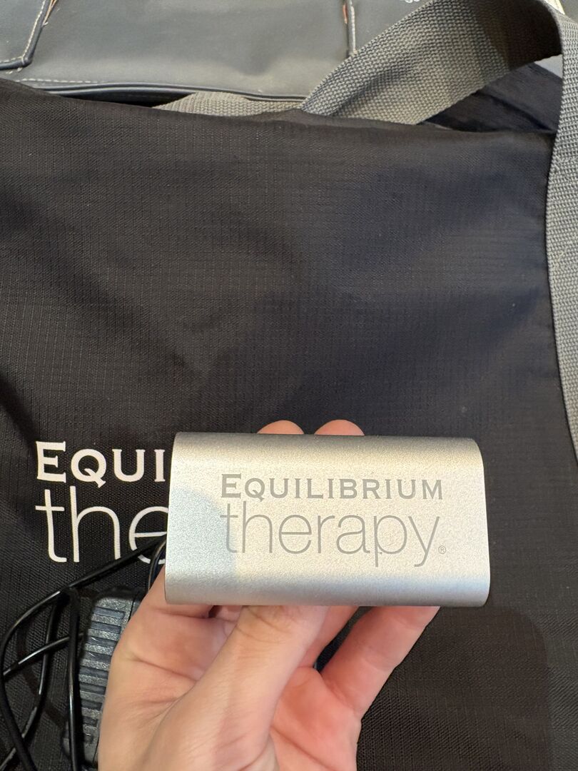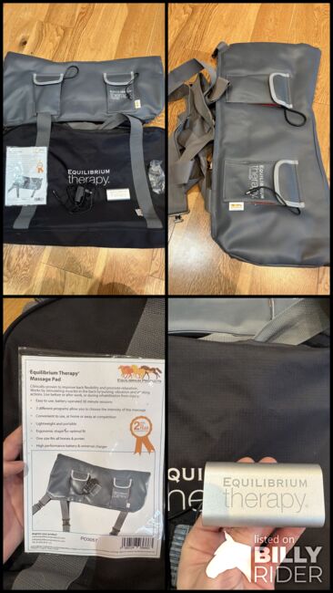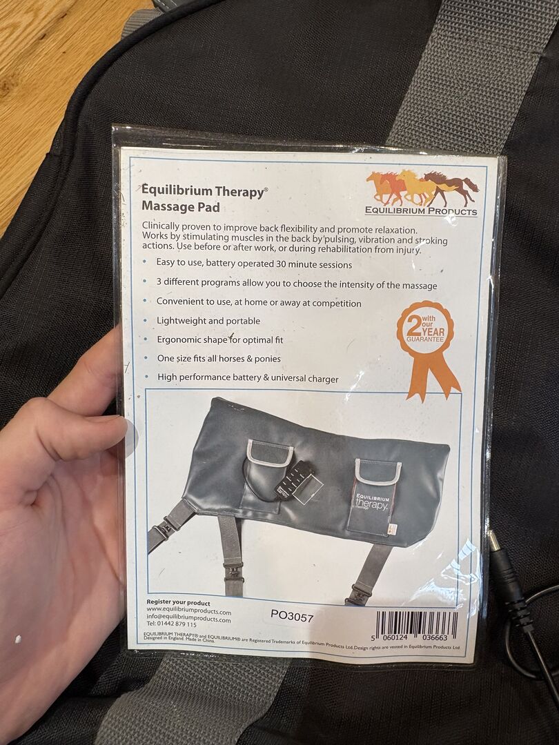 Equilibrium Therapy massage pad for horses. Includes battery, charger, carry bag and straps. Designed to help relax back muscles and improve flexibility. Fully working and in good used condition.