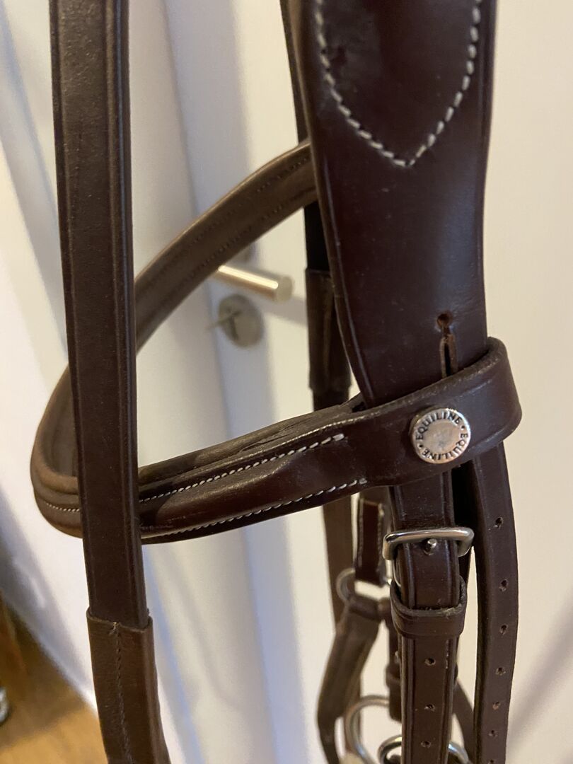 Equiline Mexican Snaffle - Sell my brown Mexican snaffle (+ bit & reins) in warmblood. She is in very good condition, but she has a small quirk (marked yellow).The original price is without bit 140€.
