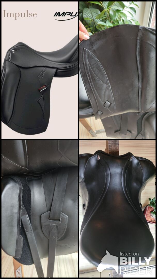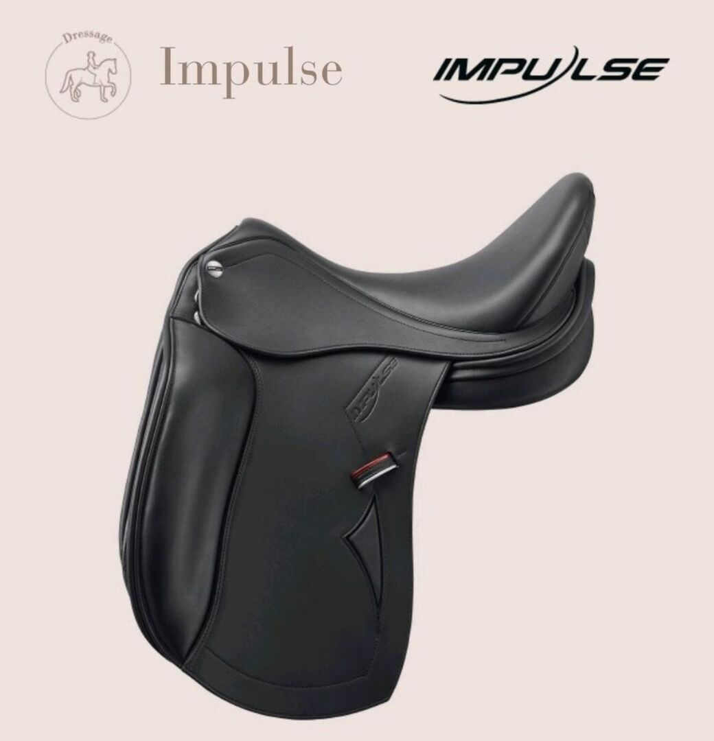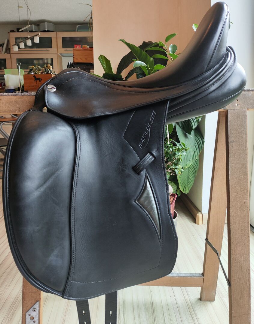 Saddle DRESSUR Mod. DC Impulse 17/33 made of double leather color black, with insert on flap and cantle made of grey patent leather no. 105, with standard panels Leaf pre-cut: B = standard shape Length of saddle flap: M = standard dimensions Height of the saddle panels: Standard Seat type: P = Deep Front blocks: W