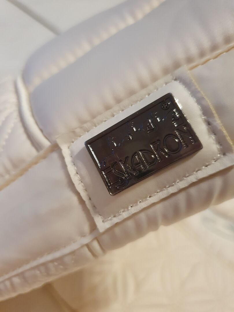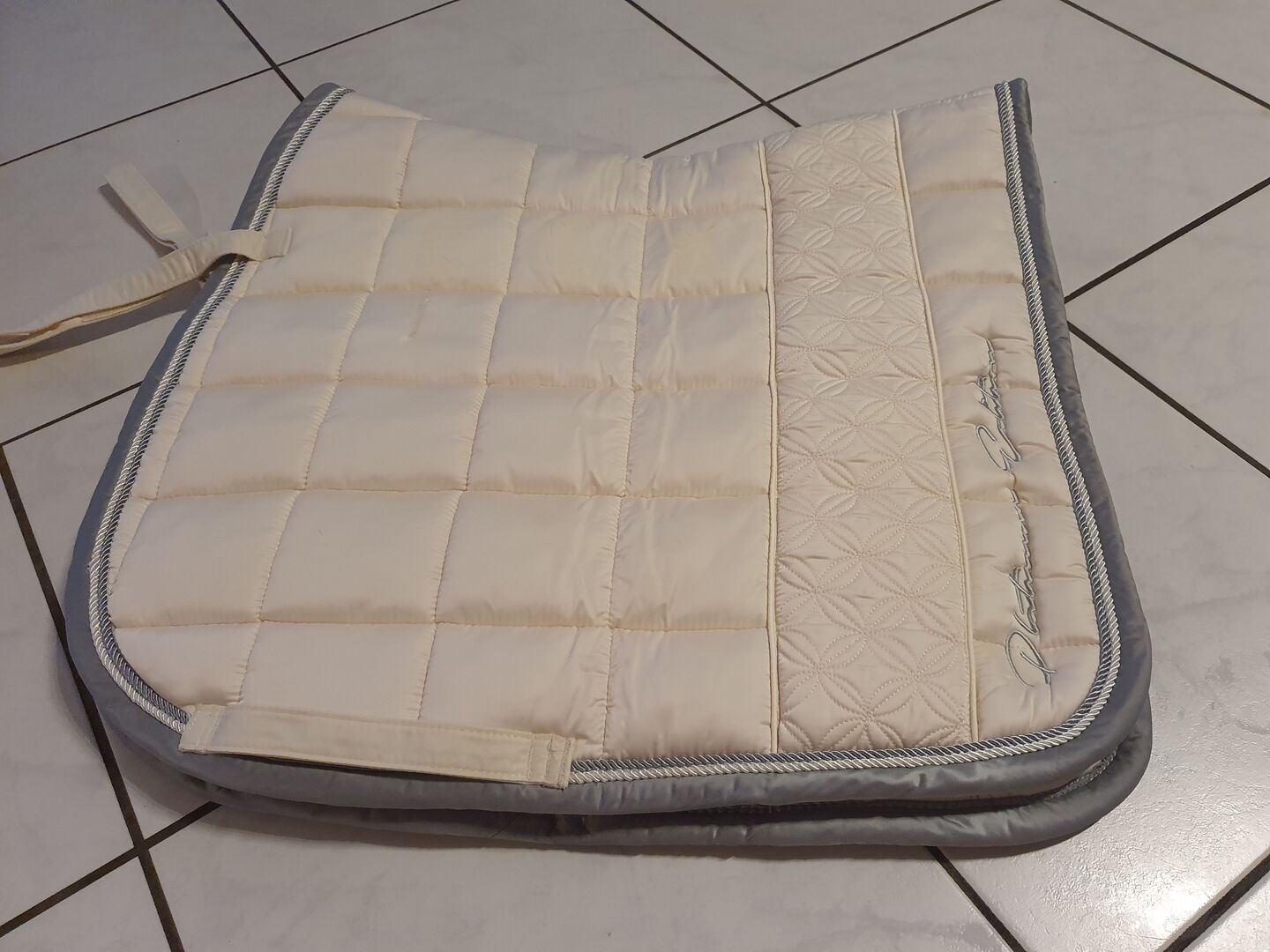 Eskadron Platinum saddle pad off-white - I offer here a barely used saddle pad from Eskadron from a Platinum collection. It is in itself in mint condition, but unfortunately has a cut in the upper fabric, which I sewed and covered with textile glue... I had unfortunately in the trunk of the car next to various other stuff knife and saddle pad lie and the paths have somehow crossed. Therefore so cheap.