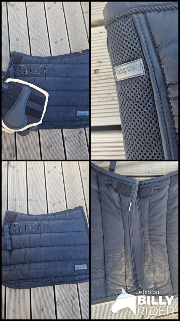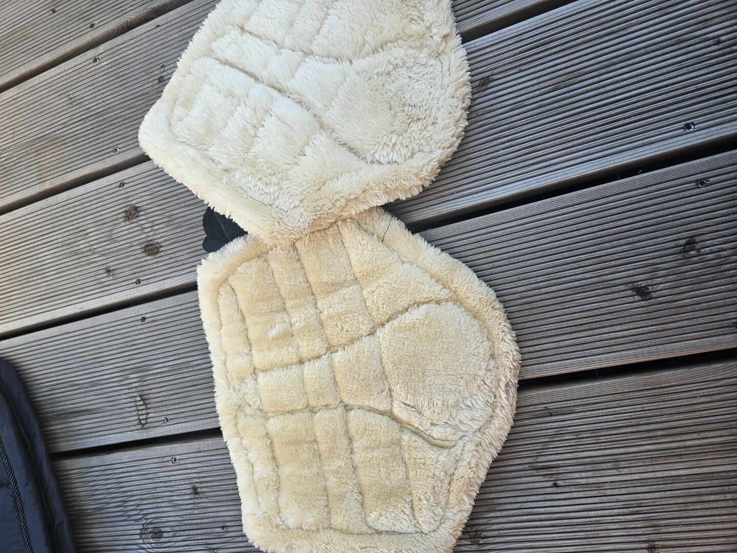 - Saddle pad size Vs - has light stains ( picture 3) - freshly washed - Fur at the top of the saddle pad is missing - Fur gaiters size M - have been used 2 times, have of course been cleaned