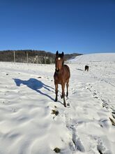 She learned the foal ABC with love and patience: - haltering - leading - Tethering - Grooming - Vet - Schmidt and has already ridden twice in the trailer for 10-15 minutes.