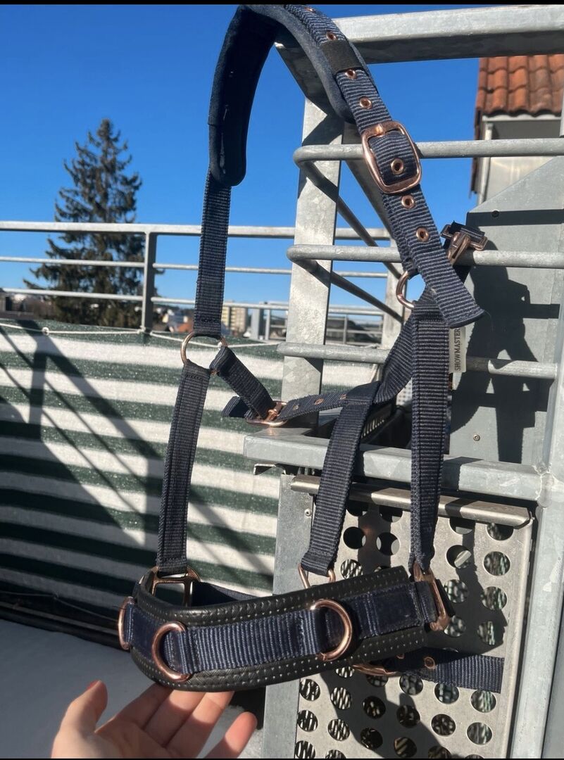 Fabric cavesson, dark blue - Ich verkaufe meinen Kappzaum aus Stoff in dunkelblau für Warmblüter. Ich habe ihn im Sommer 2025 gekauft und seitdem kaum gebraucht.