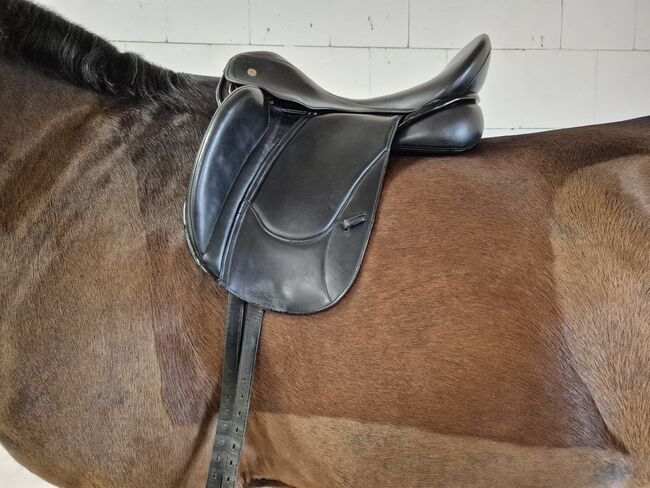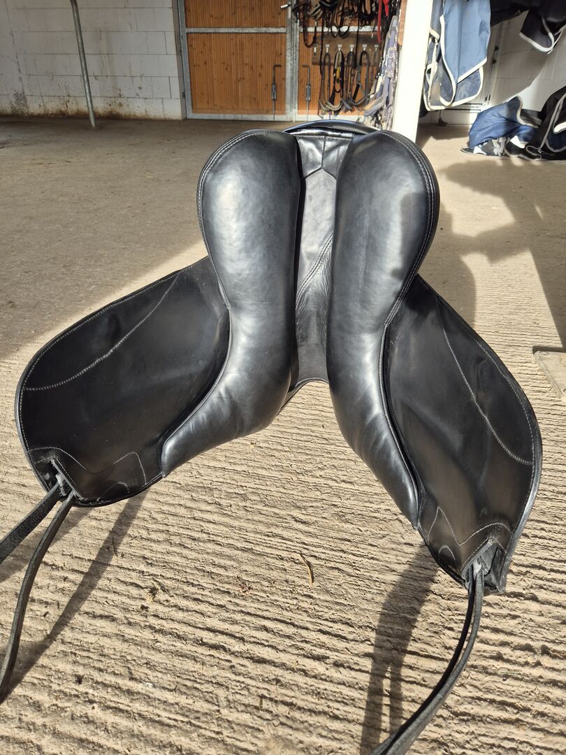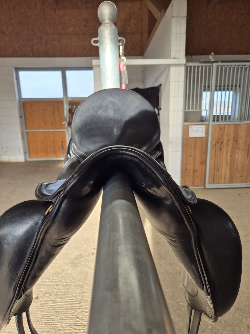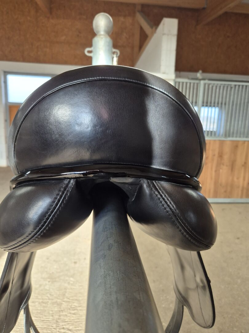 Fichtbauer dressage saddle PAURA USB Seat size 17 Special features of the seat: USB seat (deep seat) extra soft C chamber Blade 38cm, partially doubled, cut-out 2 Flash 8.5cm USB, without gullet seam Cushion front 2, center 2, rear 2 with 15mm extra volume Parallel webbing con. Color RodeoCalf black Thread color: black Black patent piping in the cantle, loop underlaid Front and rear roll welt in black patent leather