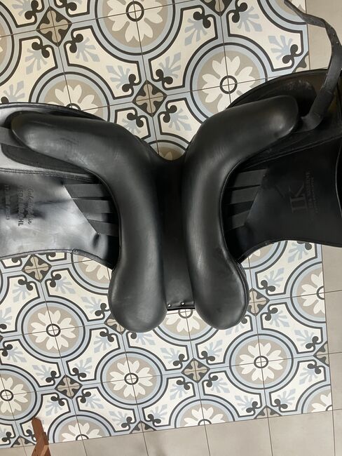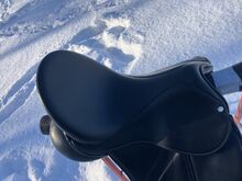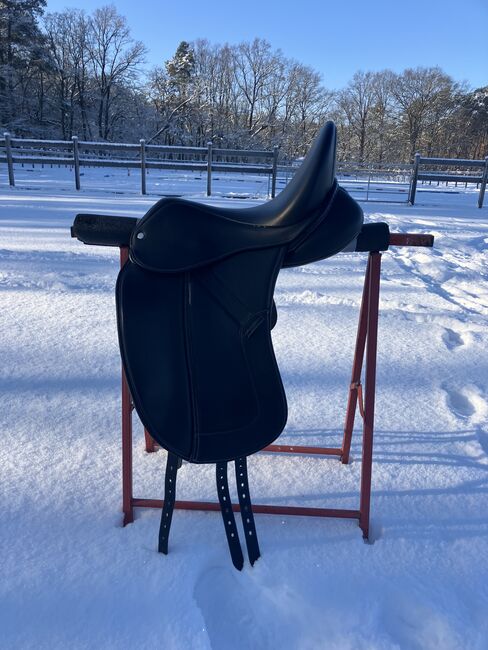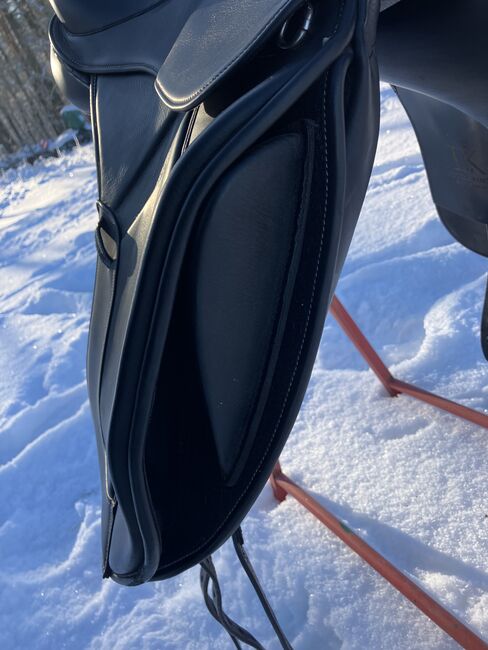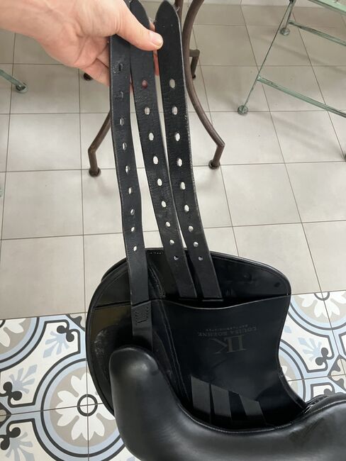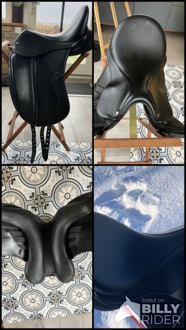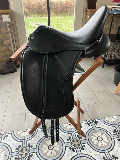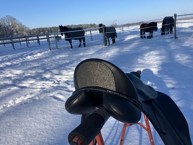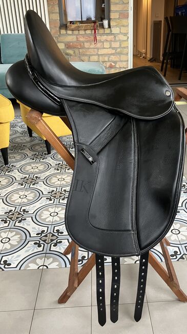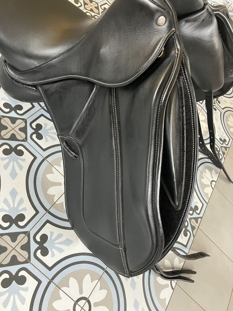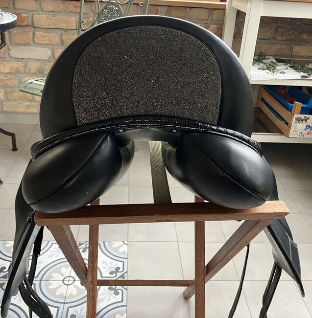 Fine dressage saddle by Louisa Koehne - little used, very good condition - For sale is a very chic, high-quality dressage saddle from the Louisa Koehne saddlery, which has only been used a little and is in very good overall condition. The saddle not only impresses with its comfortable, deep seat, but also with its elegant appearance: the glossy black leather used and the subtle glitter insert on the pommel make it a real eye-catcher. I bought the saddle new from Mrs. Koehne two years ago. It was originally custom-made for another person, which is why there is an engraved name under the saddle flap (see photo). Details: - Seat size: 17.5 inches - Chamber width: 24 cm (see photos) - Three girth straps available → individual adjustment of the girth possible - Velcro knee rolls that can be replaced or adjusted as required - Softly padded seat and well-shaped knee rolls for a stable seat - Well-maintained leather, no cracks or structural defects Note on condition: The saddle has a small visual blemish: especially when unridden, the saddle flap is not quite close to the knee rolls and protrudes slightly (see photos). This does not affect its function when ridden. The saddle has always been stored in a dry place and treated with care.