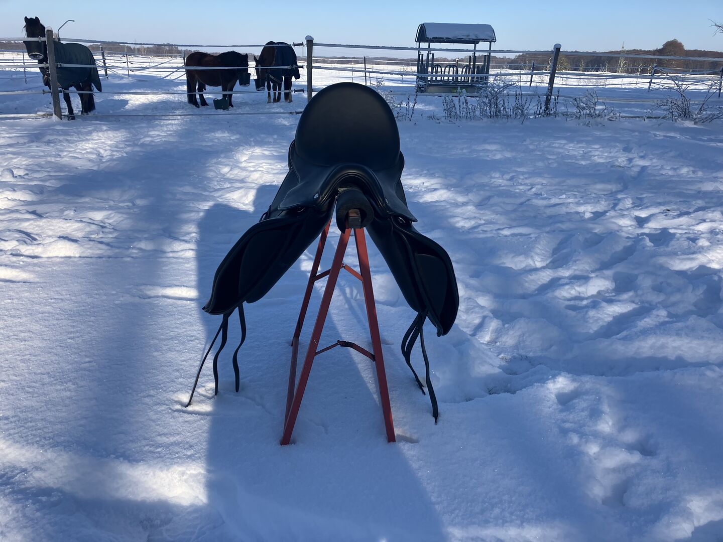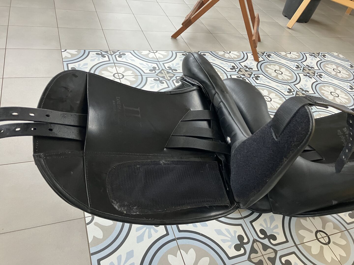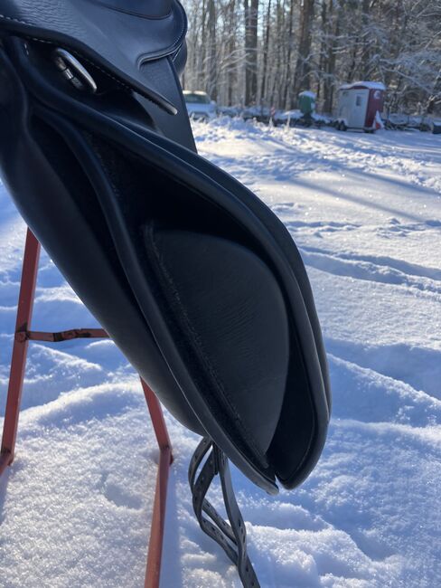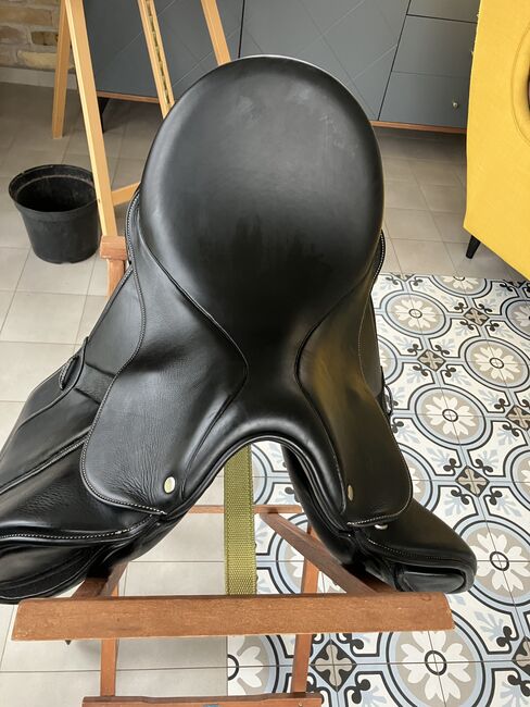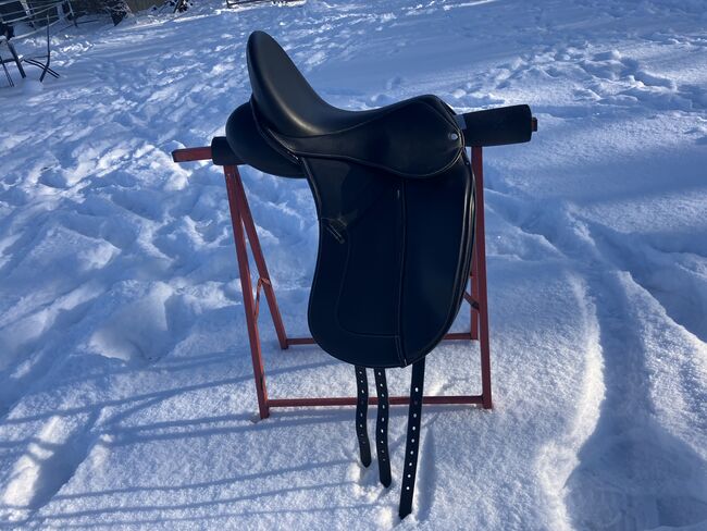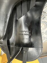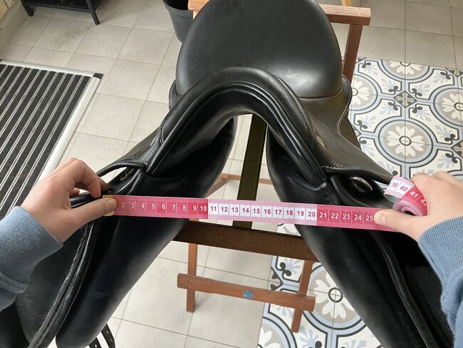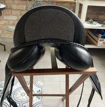 Fine dressage saddle by Louisa Koehne - little used, very good condition - For sale is a very chic, high-quality dressage saddle from the Louisa Koehne saddlery, which has only been used a little and is in very good overall condition. The saddle not only impresses with its comfortable, deep seat, but also with its elegant appearance: the glossy black leather used and the subtle glitter insert on the pommel make it a real eye-catcher. I bought the saddle new from Mrs. Koehne two years ago. It was originally custom-made for another person, which is why there is an engraved name under the saddle flap (see photo). Details: - Seat size: 17.5 inches - Chamber width: 24 cm (see photos) - Three girth straps available → individual adjustment of the girth possible - Velcro knee rolls that can be replaced or adjusted as required - Softly padded seat and well-shaped knee rolls for a stable seat - Well-maintained leather, no cracks or structural defects Note on condition: The saddle has a small visual blemish: especially when unridden, the saddle flap is not quite close to the knee rolls and protrudes slightly (see photos). This does not affect its function when ridden. The saddle has always been stored in a dry place and treated with care.