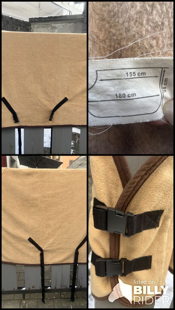 With cross surcingles. The rug has been used, but is in very good condition. Washed. However, as can be seen in the last picture, some hair has remained on the inside.