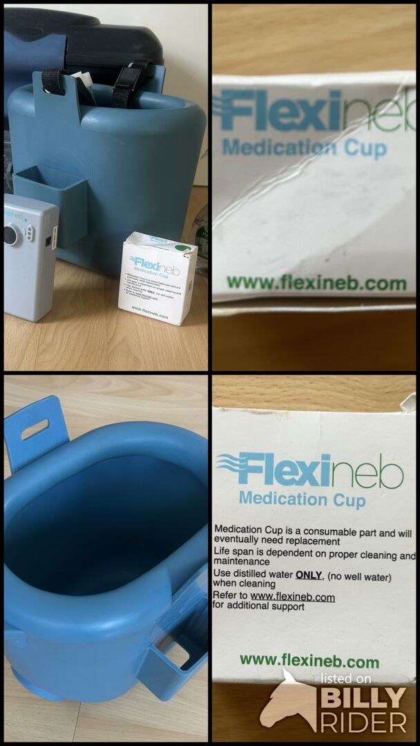 Flexineb E3 Medi blue - For sale is a Flexineb E3 inhaler for horses in size Medi. The mask is blue in color. The Flexineb was purchased in summer 2022 and has been freshly sterilized and stored dry since July 2024. It has been used regularly for a year and a half since 2022. The battery was replaced in January 2024. The connecting cable between the aerosol chamber and mask is completely new. The Flexineb is used and in good condition. It is fully functional.