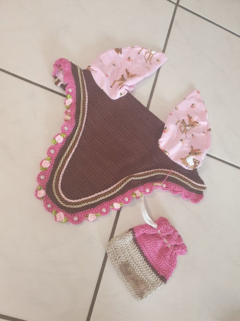 Fly hoods WB unused - I once had a phase when I wanted to have a matching hood for my horse to every saddle pad. So I started to crochet for my own needs in the evening and make myself Hsuben by hand. Everything is handmade, the ears are not sewn by machine, decorative cords, beads and other decorative elements are all sewn by hand, not glued. So for such a hood come together 10-15 hours of work. Since I now have so many that I can not use them all, I would like to give some with interest and suitable price proposal to create some space in the closet. All hoods from this ad are in the size warmblood and most still bring a treat bag :-)