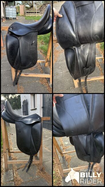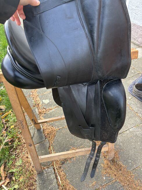 For sale Bynamic B9 dressage saddle 17,5 - Selling my beloved Bynamic dressage saddle as it has unfortunately been hanging unused in the tack room for 1 year. It sits very comfortably and the large knee rolls provide good support. I bought it second-hand myself a few years ago and have only used it very rarely since then, as I am actually a show jumper and have occasionally used it to correct my seat. The saddle hasn't been used for a year now, which is why I've decided to sell it, as it's too good to hang around. The knee rolls are adjustable with Velcro. Please see pictures for measurements. Also for sale with stirrups, stirrup leathers, various saddle pads (Eskadron) and short girth. Just make me a price proposal.
