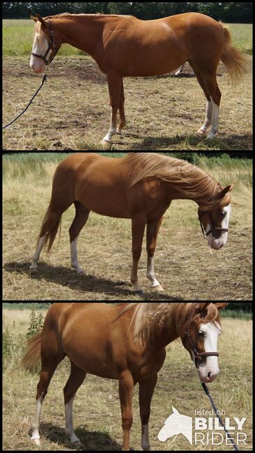 great Quarter Horse mare in gunner look - Eye-catcher with a unique character and great body is looking for a nurturing home. NW Miss Pretty Woman lives up to her name. She is not only pretty as a picture, but also has a very strong, correct build with straight legs. 5.2022 born, with an estimated final height of 150 cm. She is growing up with her peers in a herd under the best conditions. Will be sold directly by the breeder. Regularly vaccinated and wormed and presented to the farrier. NW Miss Pretty Woman is very fine to handle, attentive and willing to learn. She is very talented. Her character is simply a dream. Her pedigree is also very good: Colonels Smoking Gun, Topsail Whiz, Mister Dual Spring, PW Doc Tom Rowdy are in her pedigree. NRHA paid up. On request she can also be paid into the EWU young horse program. Top prospect for show and leisure. Location: 14929 Treuenbrietzen