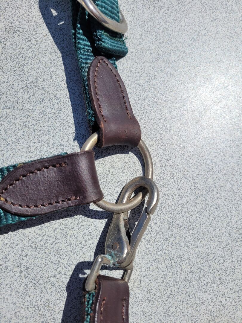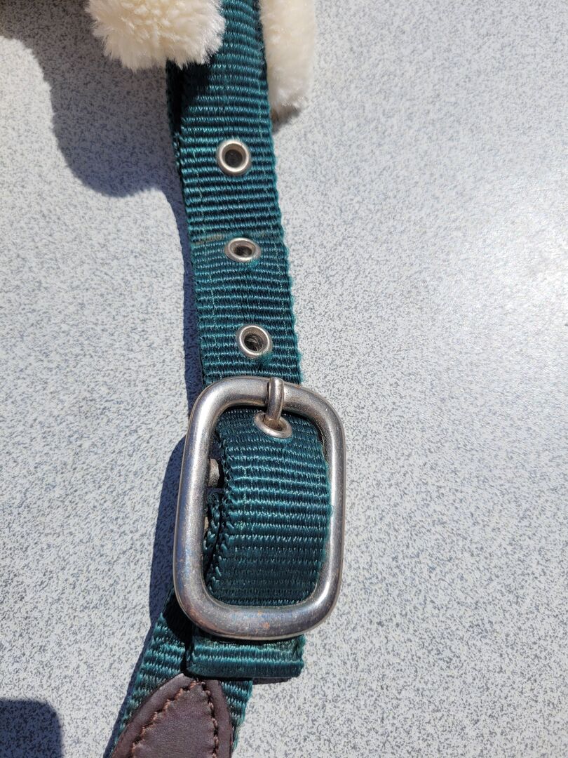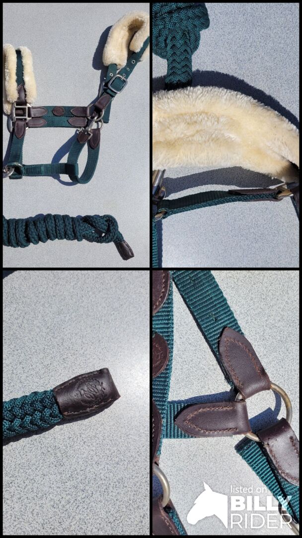 Green Felix Bühler - This green Felix Bühler set is in good condition. Besides small traces of use on the buckles, the halter and the rope have nice leather emblems. The lambskin is clean and in good condition. The size is COB.