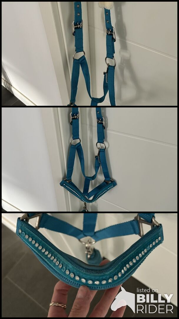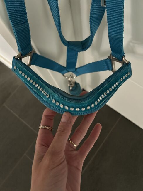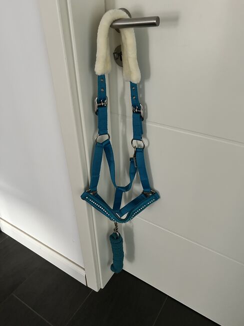 Halter turquoise with rhinestones and lambskin - The halter is completely new and has not yet been on the horse. I received it as a gift when I bought my horse. However, I don't like it at all. Unfortunately, 3 stones are already missing. The lambskin is not real. The rope is included.