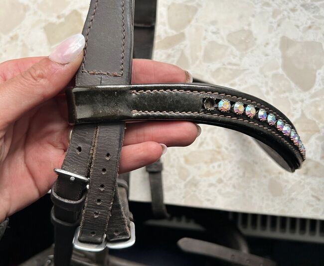 Hanoverian snaffle with varnish - Snaffle with hanoverian noseband. The noseband is lacquered, as is the browband. A stone is missing from the browband, but is hardly noticeable. Without reins.