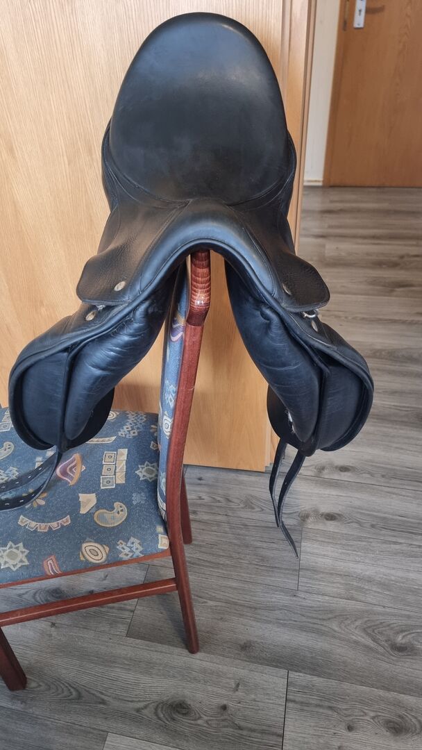 Harry Dabbs Elegant Dressage Saddle 17.5 inch - I am offering my Harry Dabbs Elegant dressage saddle in black with 17.5 inches. The saddle is in very good condition with few signs of use, the gullets were renewed in 2022 and replaced by an adjustable girth and overall adapted to my horse, the saddle was last padded in 09/23 (invoices are available). The saddler estimated the current value at approx. 1000€. The saddle was fitted on a warmblood with a little swing in the back, broad shoulders and medium withers. The large knee rolls and the deep seat give the rider stability without constricting, the leather has an excellent grip, so that the saddle also gives the rider a good hold in the terrain and over small gymnastic jumps. The saddle number and dimensions can be found in the pictures. The saddle cover is included.