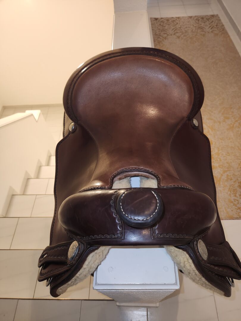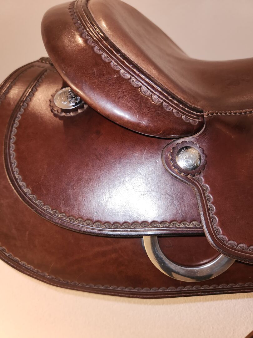 High Horse western saddle FQ/XFQ lay on sporty Fribi - Very high quality, extremely comfortable all-round saddle. Soft leather, genuine lambskin. Fitted on a Fribi with a fairly straight back. Grateful saddle that fits many horses from full quarter upwards. Concho 25 Concho bottom (rings) 36 Length 70 Seat 16