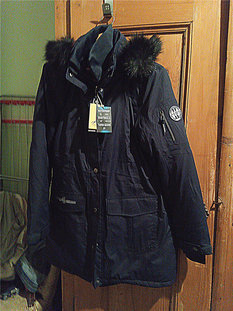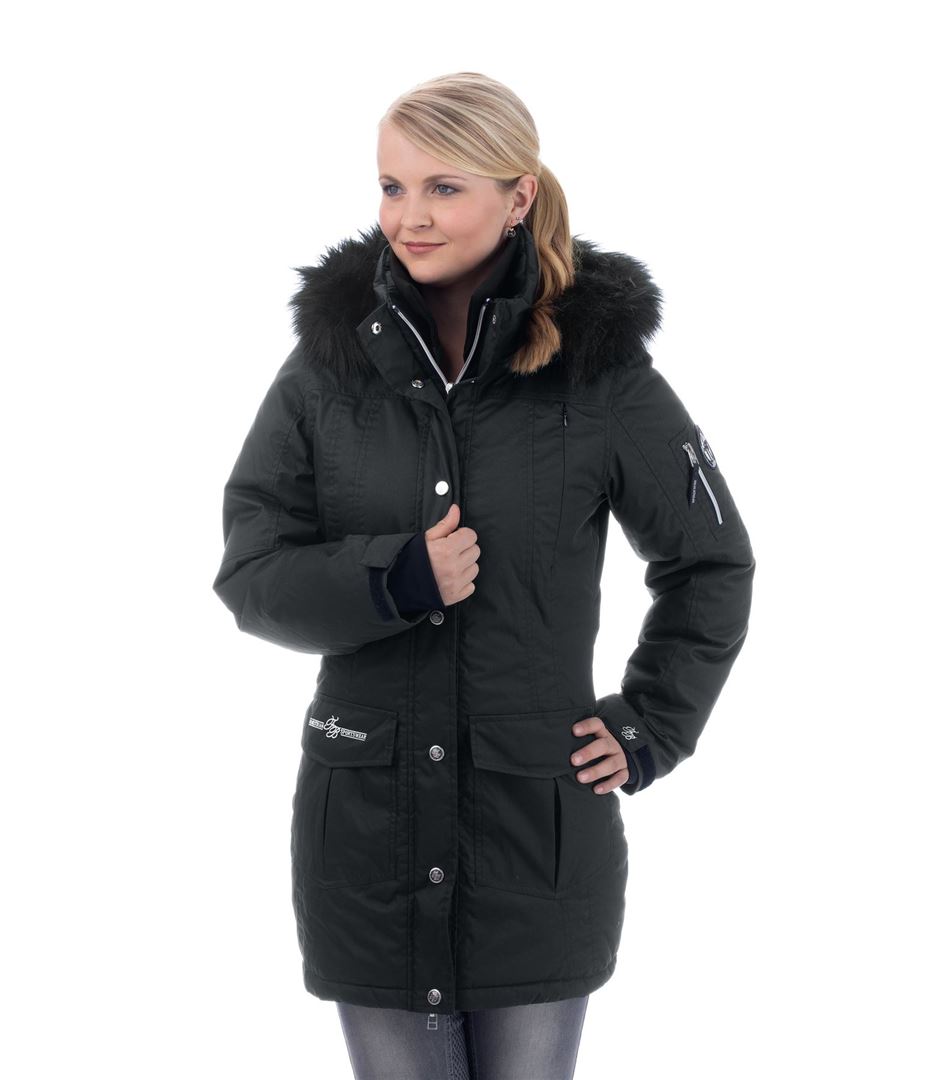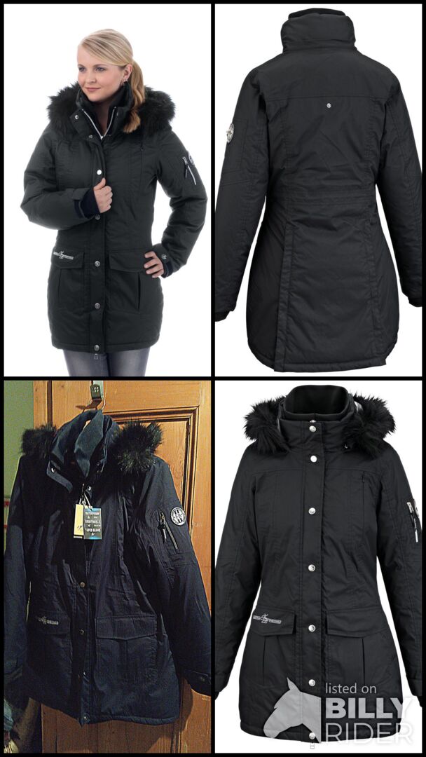 Hooded functional riding coat Lisa - Functional riding parka by Felix Bühler, dark blue, size M (38 - 40), NP 109,- Euro. Hood can be fixed at the back, is adjustable and removable like the fake fur trimming. Waterproof, windproof, breathable. Warm down imitation lining. Drawstring adjustable waist size, 2 long riding slits with zips at the back, concealed 2-way front zip, 2 flap pockets, 1 zipped chest pocket, 1 zipped sleeve pocket, 1 zipped inner pocket, adjustable sleeve size, wind trap made of stretch material, removable inner collar made of ribbed material. Unworn. Wear the coat in a different size, it is super warm and comfortable! Shipping within Austria cash on delivery possible.