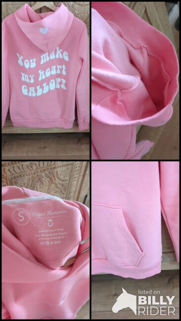 Hoodie Royal horsemen Valentine Gallop - Hoodie from Royal horsemen in pink, size S. With statement print on the back, embroidered hearts on the hood and sleeves, kangaroo pocket and hood. New and unworn, only washed once in a laundry bag with mild detergent. Runs slightly larger, also fits a 38. Very soft inside, high-quality workmanship. Is a limited edition for Valentine's Day, 2026 collection. Original price 59€