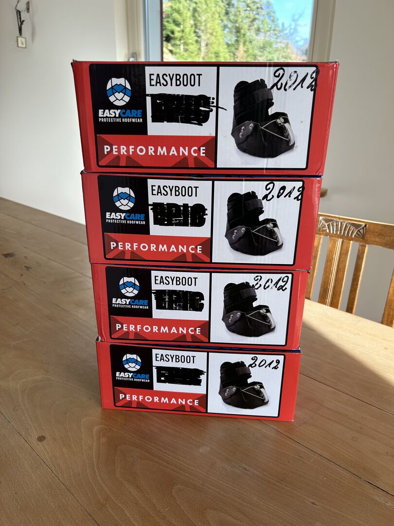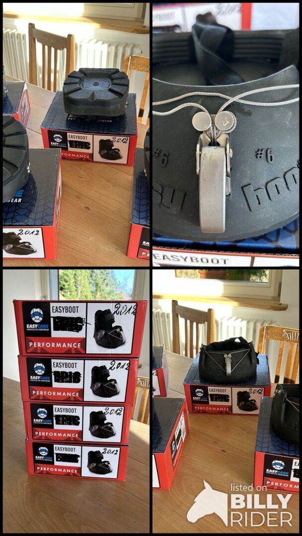 Hoof boots Easyboot Performance - Unfortunately, these hoof boots don't fit. I was very impressed with the workmanship, they are sturdy and the clasp closes "bombproof"🙂 My mare has severely underslung heels, unfortunately they are not suitable for this. I have tried on one shoe once on a clean stable mat, so they are brand new, as you can see in the photos. Proof of purchase is available, I paid € 104,- per boot. I would sell them for € 45 each. They are are size 6