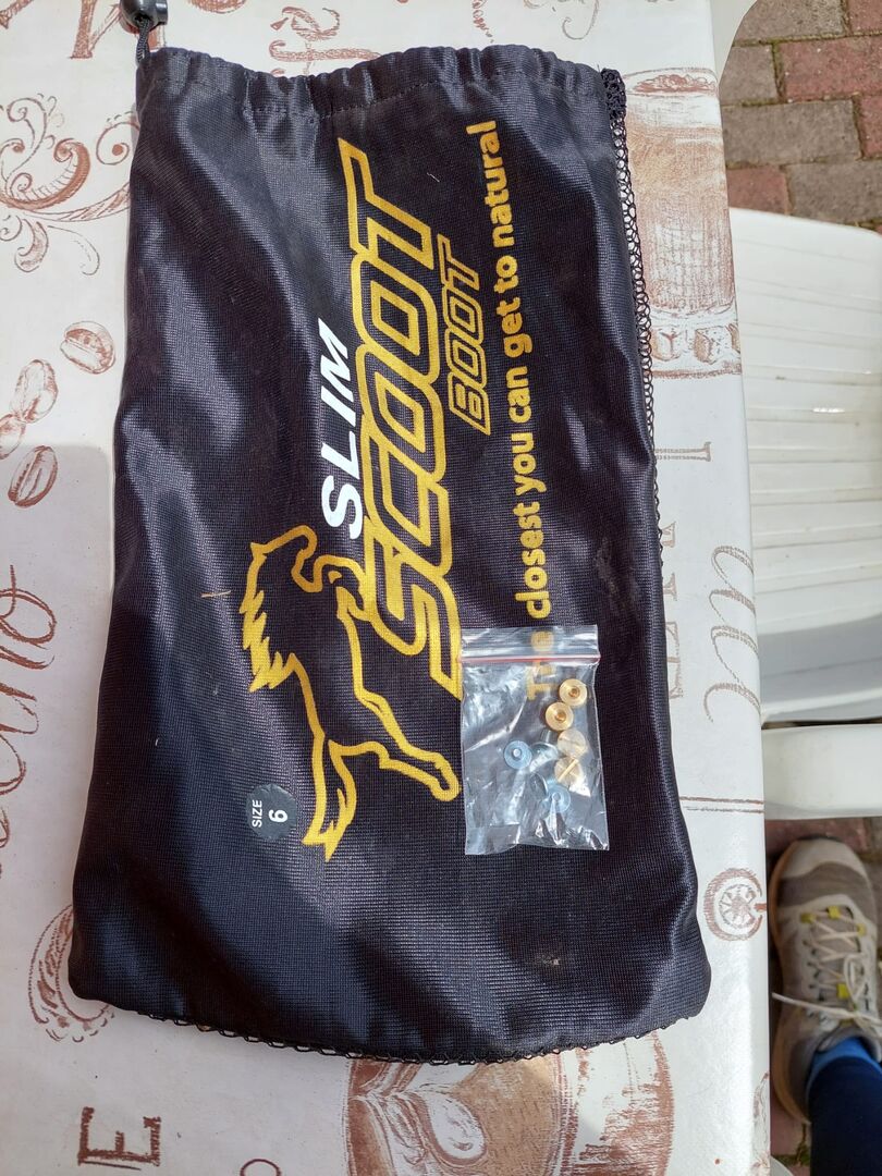 Hoof boots Scoot Boots size 6 slim - For sale is a pair of hardly used hoof boots from the company "SCOOT BOOT - the closest you can get to natural". There are also some accessories: the original sliders, as well as replacement screws and insoles cut to fit. We bought them after a bout of laminitis and now need 2 sizes smaller and no more insoles 😊 They are great hoof boots with top quality and a super fit. We are totally happy with the brand. The horse can still walk barehoof and we use the shoes for rides.