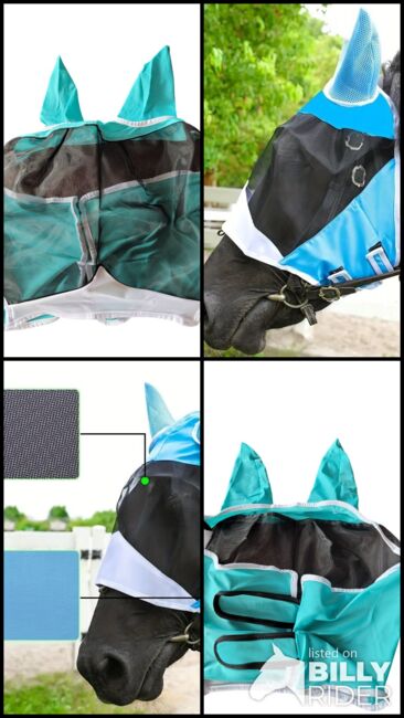 Enjoy a fly-free riding time with this set of two high-quality horse fly masks with practical ear protection. Thanks to the fine mesh fabric, the elasticated horse masks offer optimum protection against annoying insects and ensure a comfortable fit. Ideal for use during outdoor activities, they provide your horse with a comfortable and effective barrier against flies. This turquoise fly mask with ears offers your horse both protection and comfort. Made from high quality, elasticated materials, it fits perfectly to the shape of your horse's head and is designed for ease of use. The pack contains two units in size M, ideal for multiple horses or for storing for travel use. Your horse will be well protected without sacrificing style thanks to these practical and durable masks.