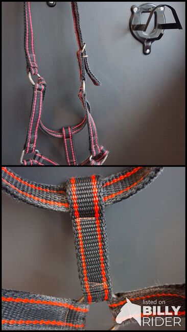 I am selling a well-maintained horse halter. It has been used but always treated properly and is therefore clean, stable and fully functional. The seams are intact, the fittings in good condition, no tears or fraying. Has been freshly washed.