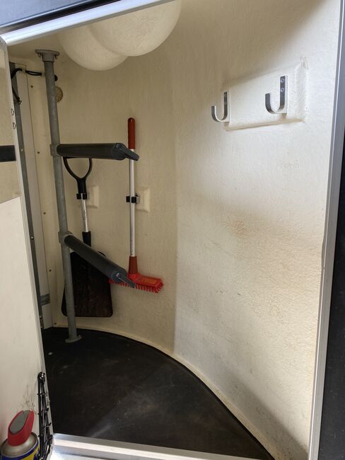 Technical data: - First registration: 04/2012 - Permissible total weight: 2400 kg - All other technical data please refer to the corresponding pictures (vehicle documents). - Aluminum floor - Wooden body (anthracite) with poly hood (granite green metallic) - Decorative stripes design "Künster - Single wheel fender made of plastic (black), - standard rear flap (without wing door function) - Tarpaulin lift with integrated net - 2 rear side struts - 4 rear flap hinges - 2 pop-up windows in polyester hood - Lifting device gas shock absorber - Rear strut closed - License plate holder with step - Front maneuvering handle - V2A screw connection - spacious tack room (lockable) with two pull-out saddle holders, hanging device incl. broom and shovel, mirror, hook and practical net bag.
