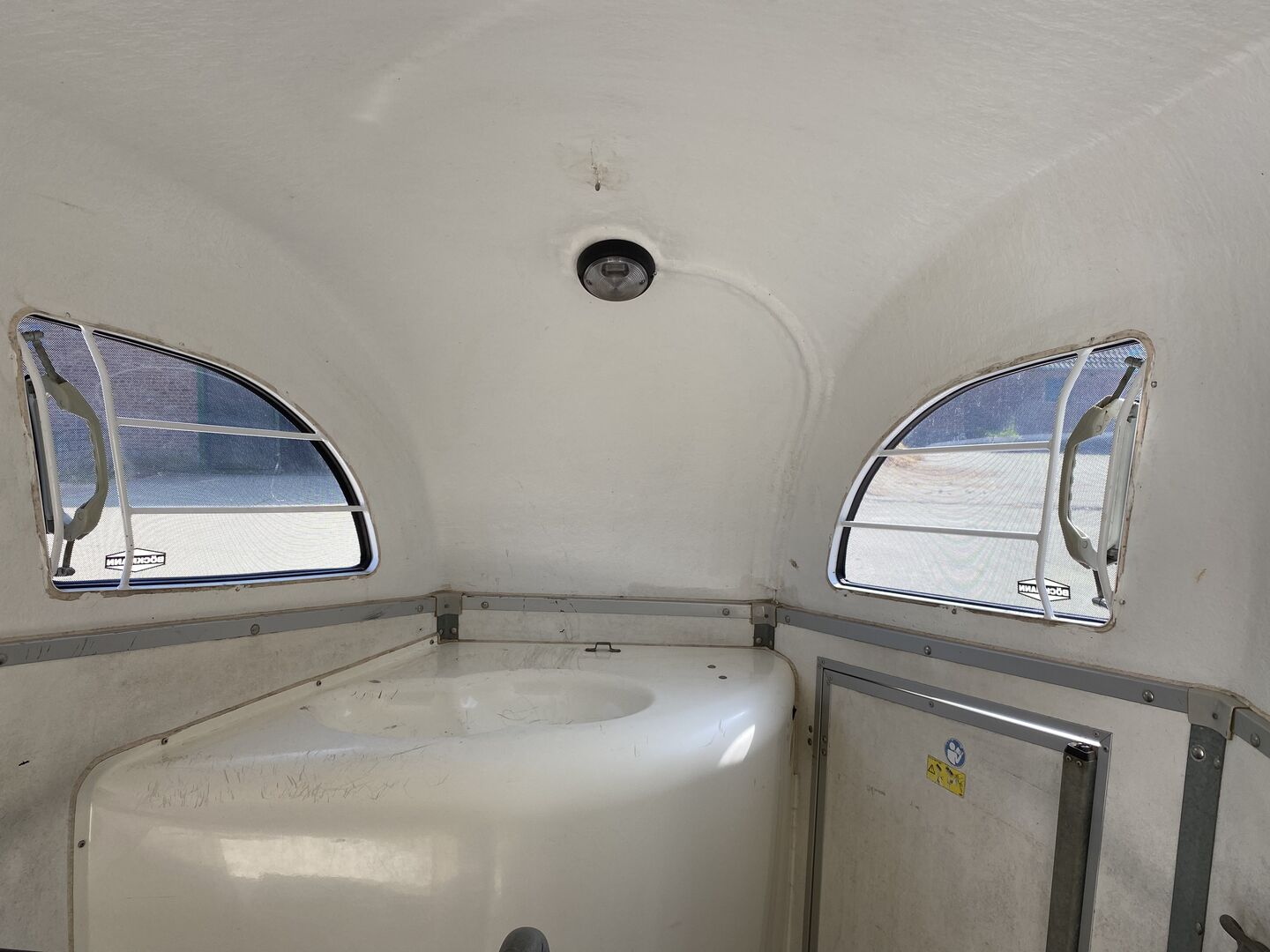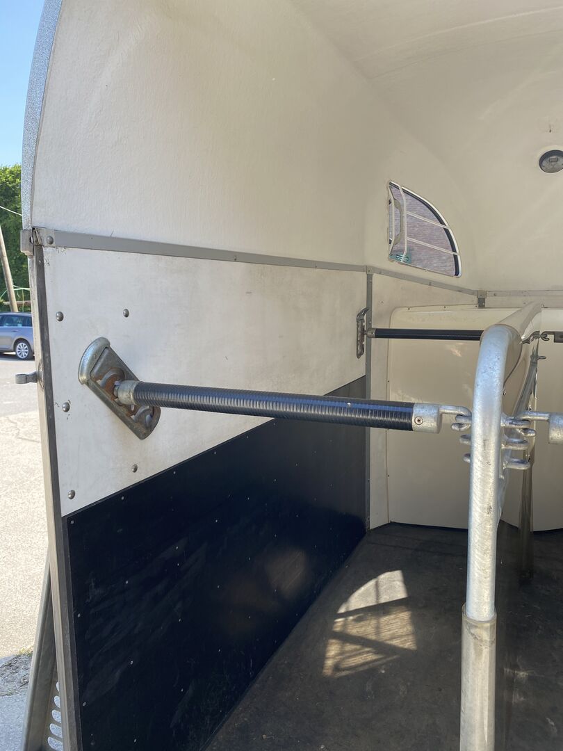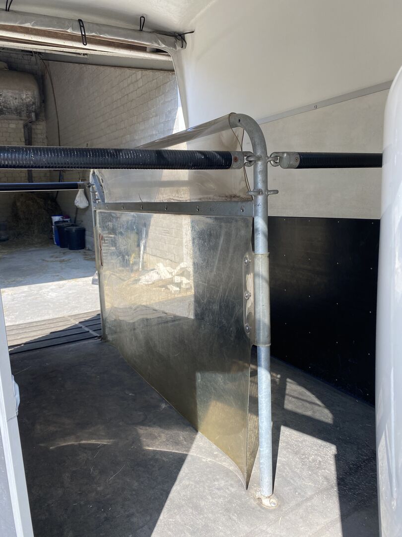 Interior equipment: Rubber floor glued and sealed, rubber on loading flap (integrated step bars) and side stop, interior lighting, Multi Safe System (safety stall bar system), PVC clear partition with PVC top, feed trough above tack room, step guards on both sides of exterior walls.