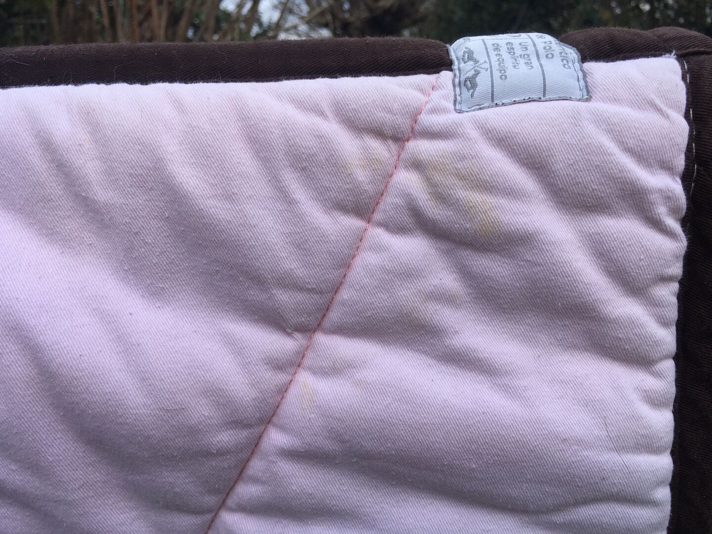 Hv Polo jumping saddle pad - Rarely used, light pink jumping saddle pad with dark brown edge. There are only a few small discolorations on the left side, but they are not particularly noticeable (see picture).