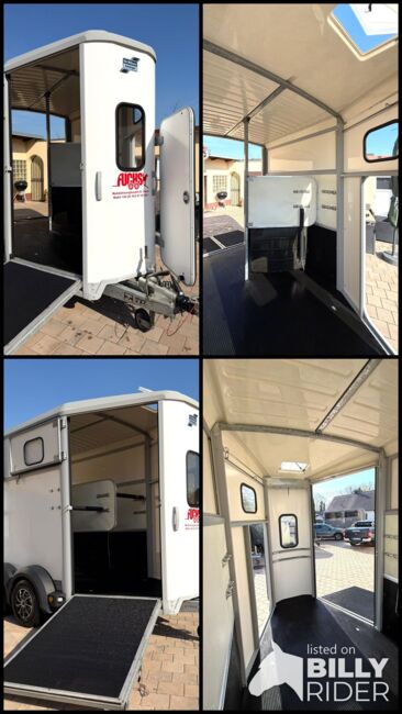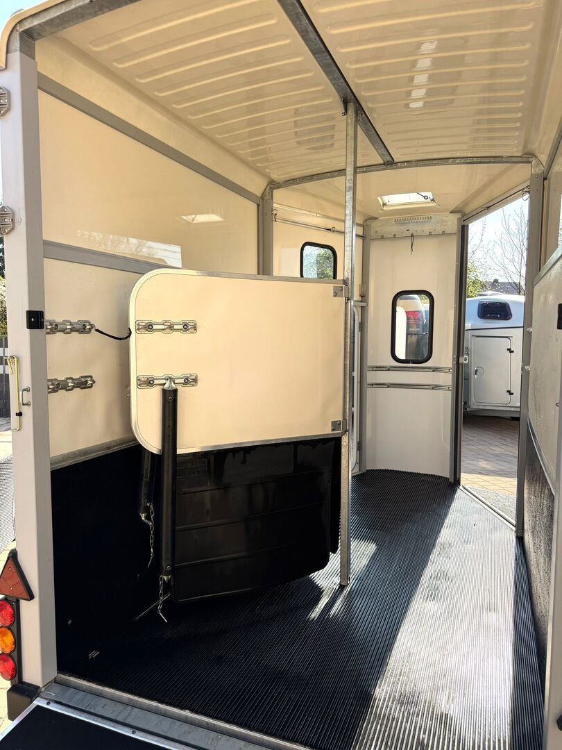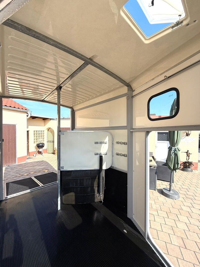 - First registration 05/2014 - Unladen weight 954 kg - Permissible total weight 2600 kg - Max. drawbar load 150 kg - HU until April 2028 - Front exit - Front window - Roof hatch - PVC partition wall completely removable with adjustable swivel beam - Pony compensation - ALU FLOOR - Rubber floor - Folding window at the rear - Folding window at the front exit - spare wheel