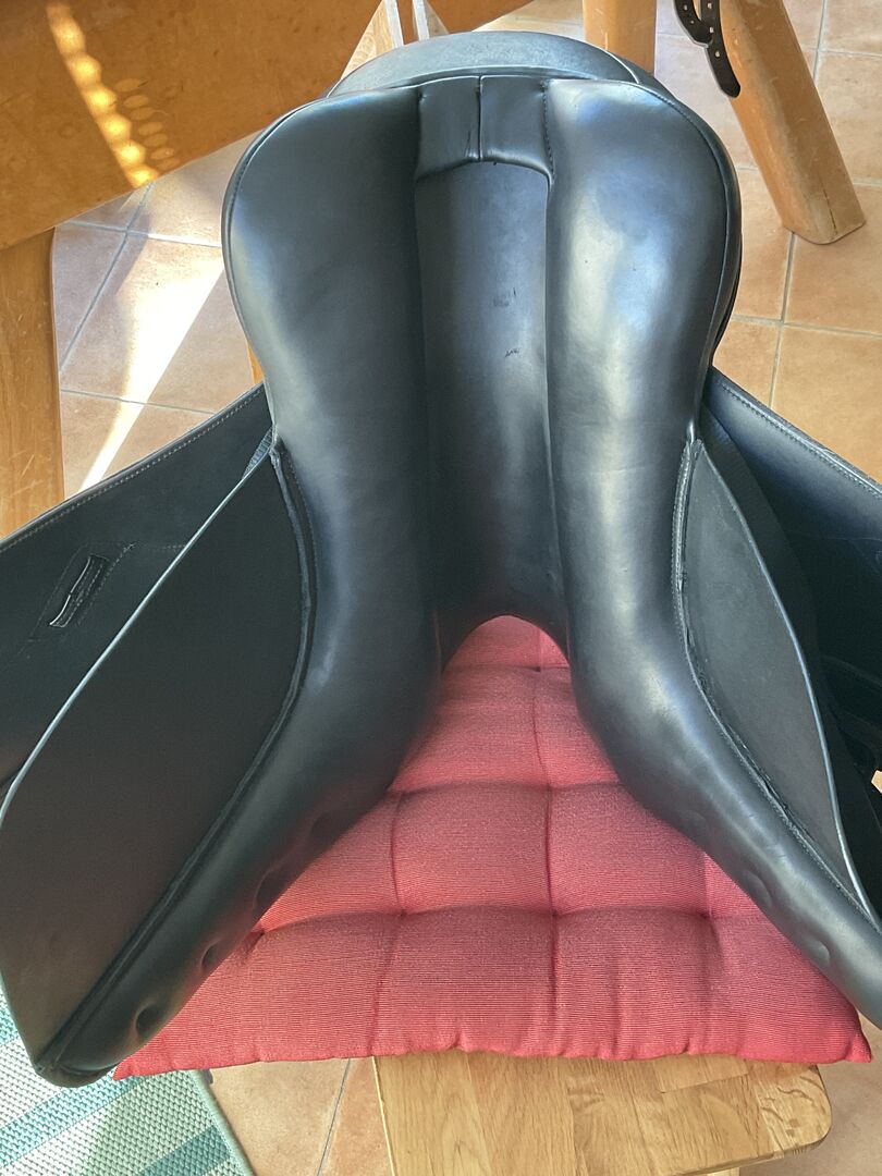 Chamber width: cold adjustable Color: black panel filling: wool Condition: new Leather: doubled calfskin Fit: fits well on short, straight to slightly curved horse backs with medium-high withers Cushion: Wedge panel Crupper: adjustable Velcro crupper, medium size Seat: extra deep