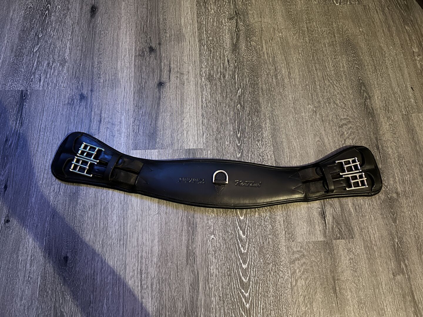 Kenautr moon girth dressage girth short girth 65cm - For sale here a used but in very good condition moon short girth from Kentaur. It has a length of 65cm. This is from buckle to buckle. It also has elastic inserts on both sides of the buckles, which makes girthing easier. I have only recently purchased the girth myself, but unfortunately my horse needs a different type of girth, so he can move on. The girth has been freshly cleaned and greased, so it is ready for immediate use. There may still be a few hairs on it. The belt is black and made of leather. The buckles are silver and completely rustproof.