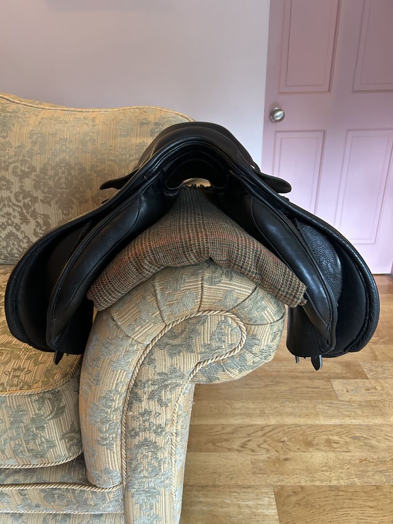 K&M S Series black pony general purpose saddle, regular leg, 16”, knee rolls, adjustable gullet fitted with blue bar, good condition, checked by saddler twice yearly, few scrapes & bumps, purely cosmetic as shown. Can be fitted to most ponies - has been fitted to two completely different ponies and started our daughter off at pony club! Comes with burgundy K&M fleece cover. Great little saddle.