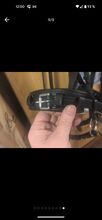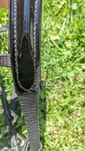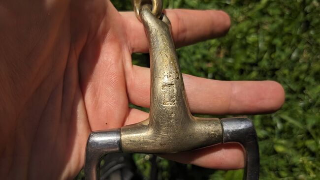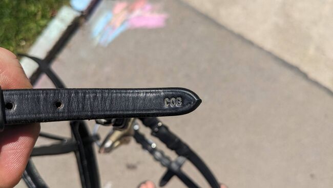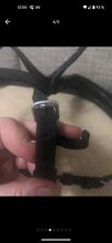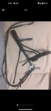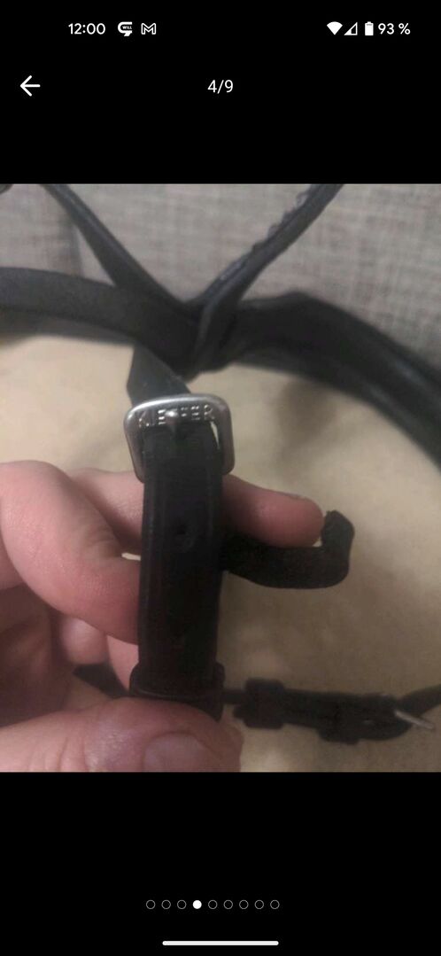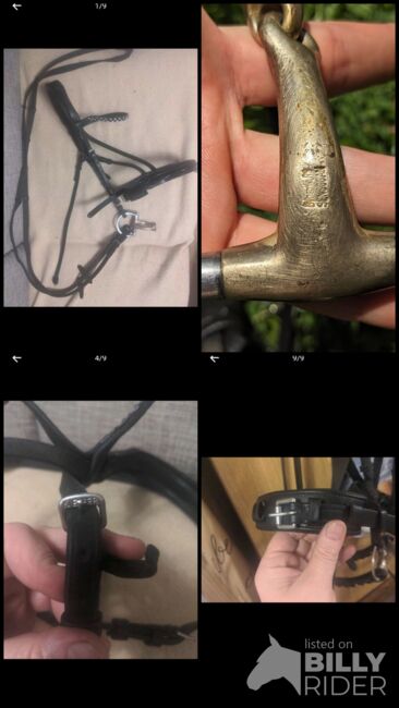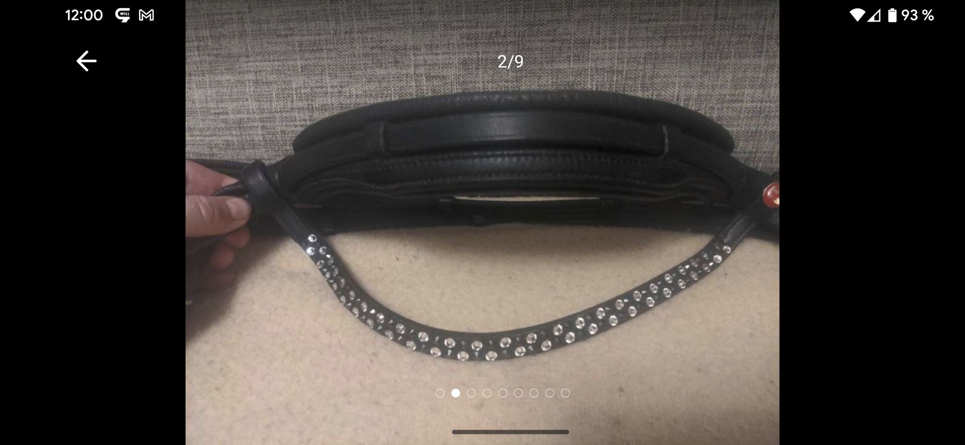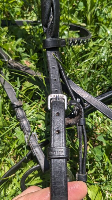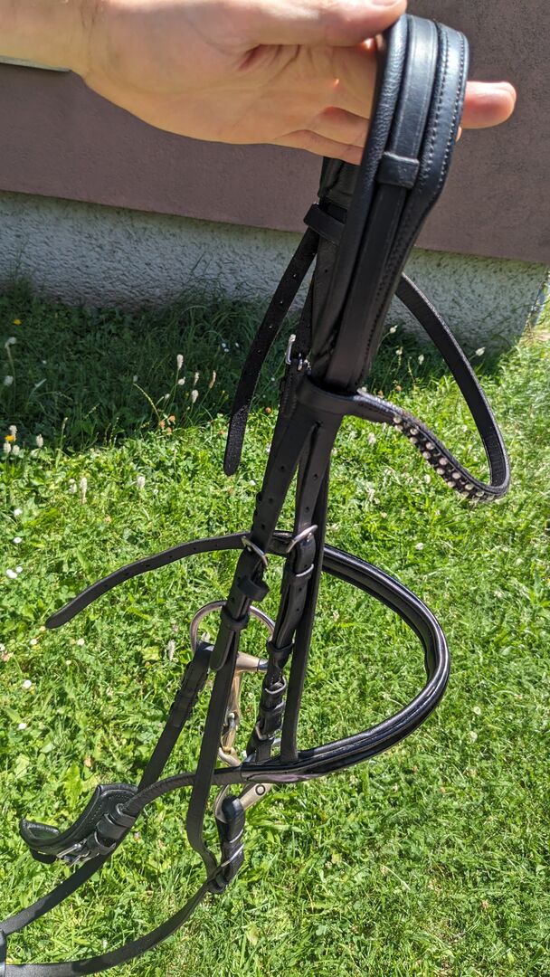soft padded headpiece with cut back for good ear mobility black-silver stones on the browband all present English combined noseband, but the locking strap is missing Lacquer on the noseband already somewhat damaged on both sides (see pictures), still nice in the middle (see picture) buckling of the noseband with additional leather protection (see picture) one strap on the right side of the throat strap is broken (see picture)