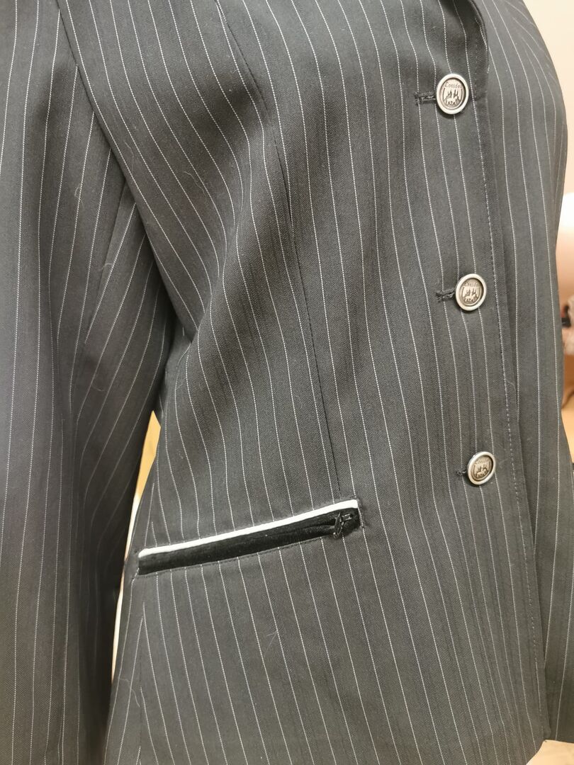 The pockets are zippered and have a velvet strip. The jacket has a fitted cut.