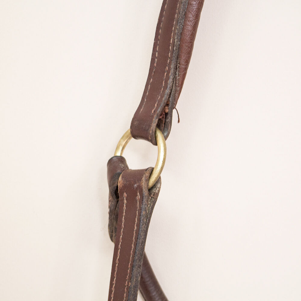 Leather halter brown with gold COB - The beautiful leather halter in brown is the perfect companion in everyday life. It is perfect as a stable halter. The halter is adjustable at the neck and noseband and thus fits many different horses and ponies. It has size Cob and is brown with beautiful golden fittings. It is softly lined. The halter has traces of use.