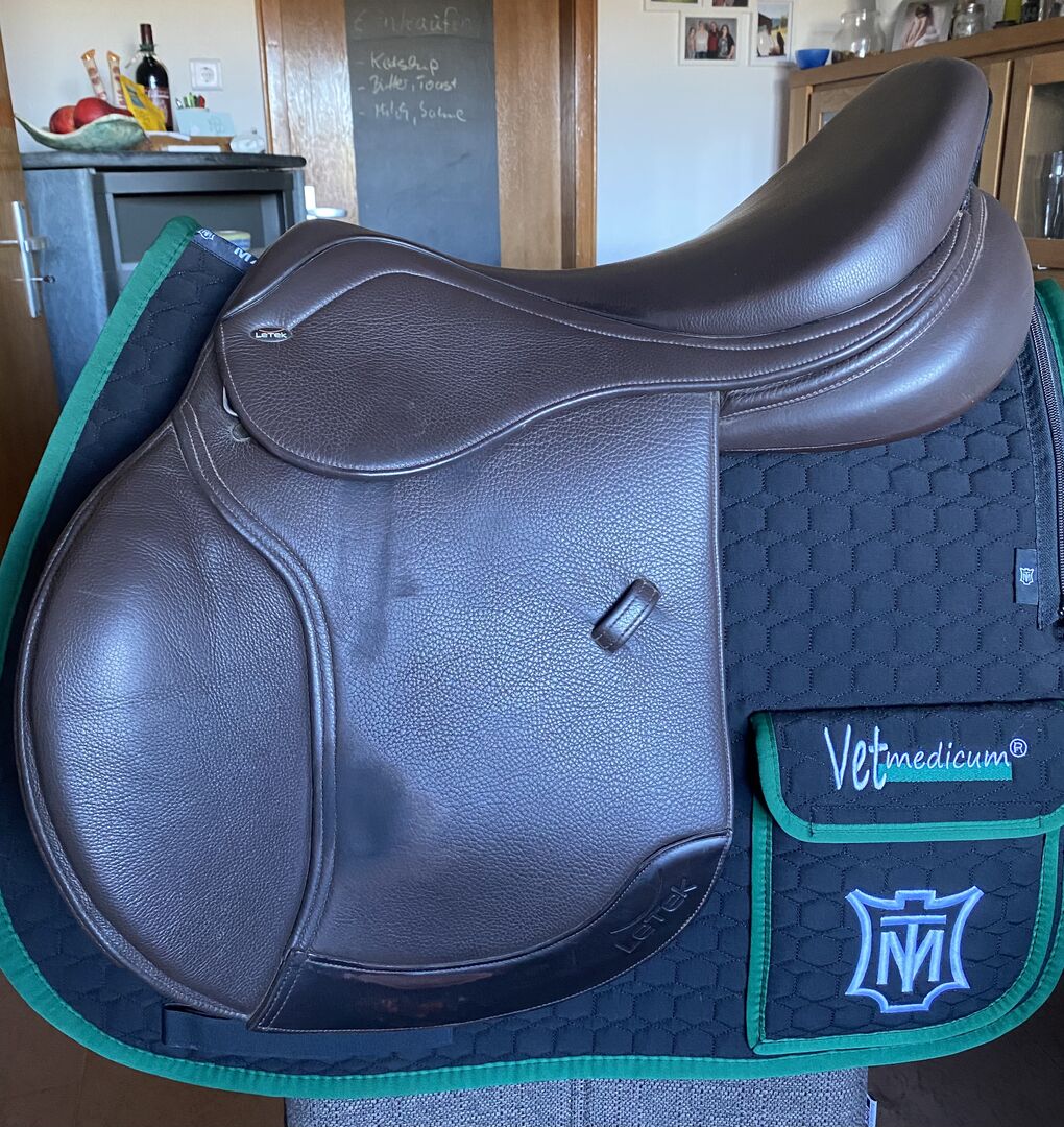 LeTek jumping saddle - Sell our LeTek jumping saddle, brown because it no longer fits our horse. On request, matching bridle, breastplate, girth 125 cm, and stirrup leathers (all matching in brown) can be purchased with. PricesVB: 850€, kpl 650€, saddle only
