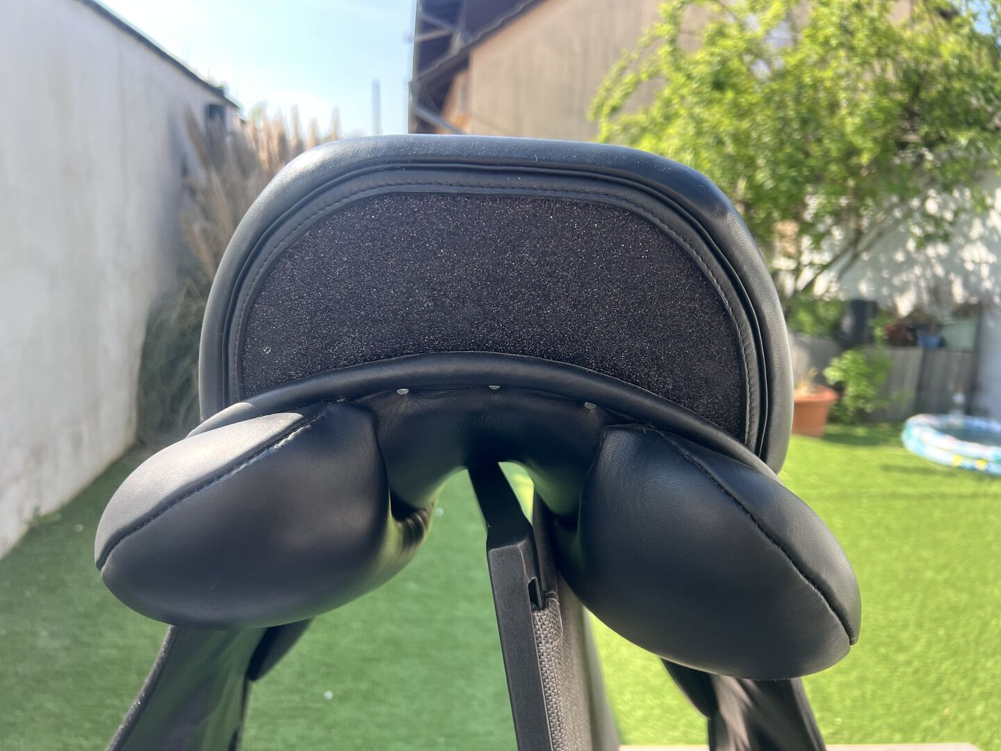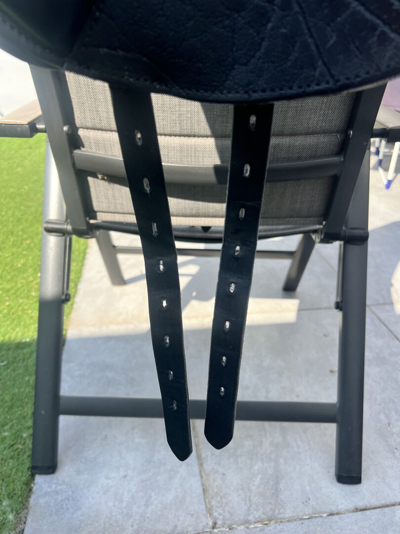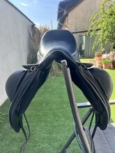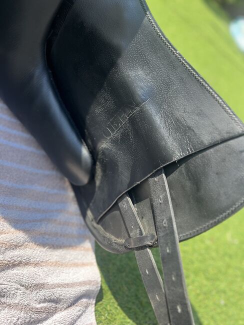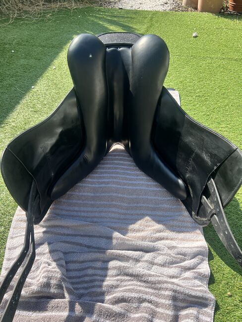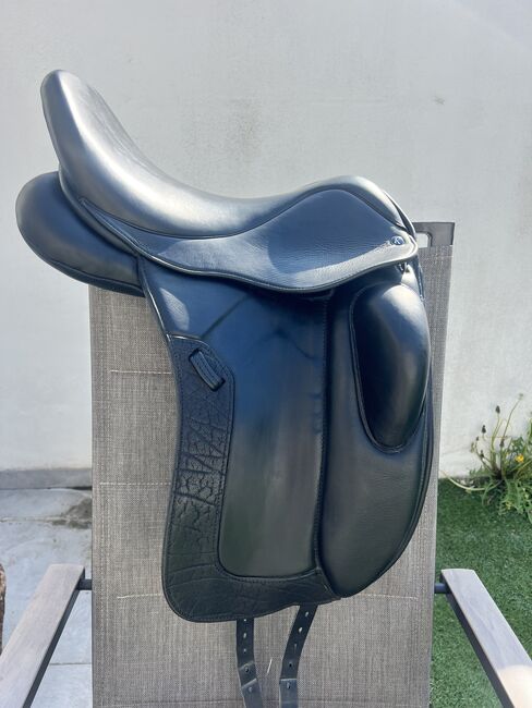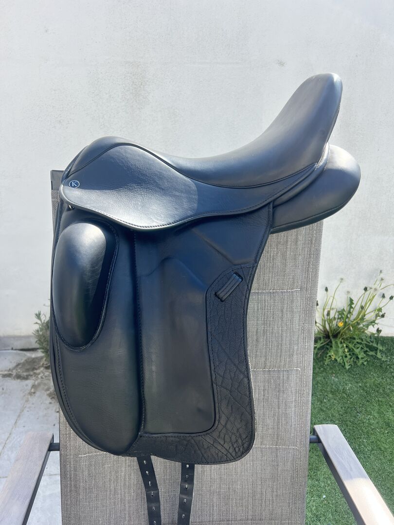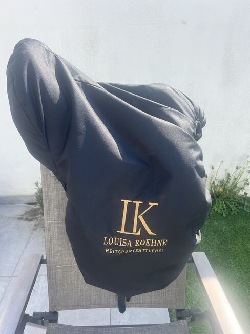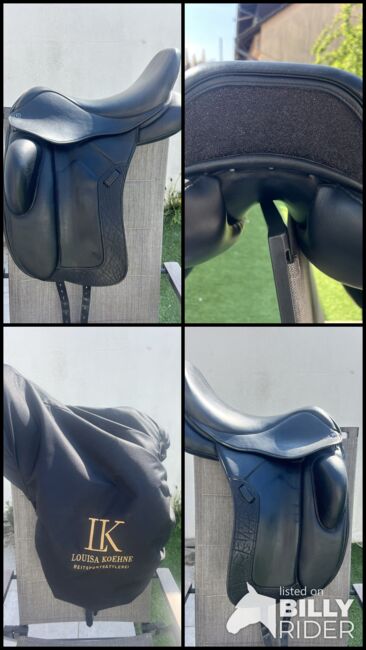 Louisa Koehne dressage saddle 17.5 with rhinestones - I am selling a Louisa Koehne dressage saddle in 17.5 with rhinestones. The saddle has no blemishes and is like new. Delivered at the end of July 25, soft seat, girted spring steel tree, attached knee rolls, cold adjustable gullet plate, flared seat, round cantle, mono flap, buffalo leather saddle flap. New price was 4357€.