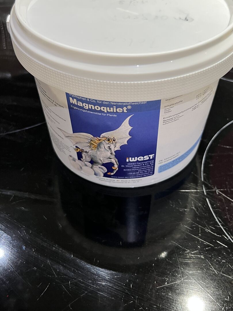 Opened horse feed from IWEST brand. There are still 828g inside, see photo. Stored dry and tightly closed in a bucket. New price 110,00 Euro. Bottled see bottom of bucket photo Shelf life: From production date the best before date is 12 months. Information from Iwest homepage.