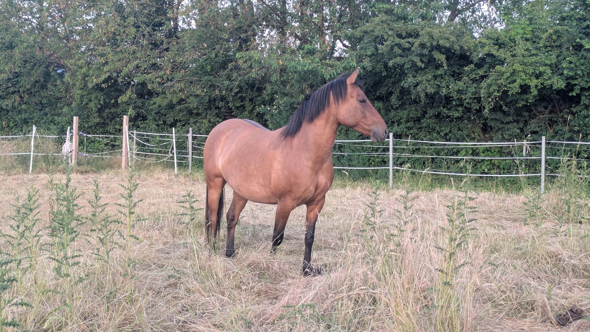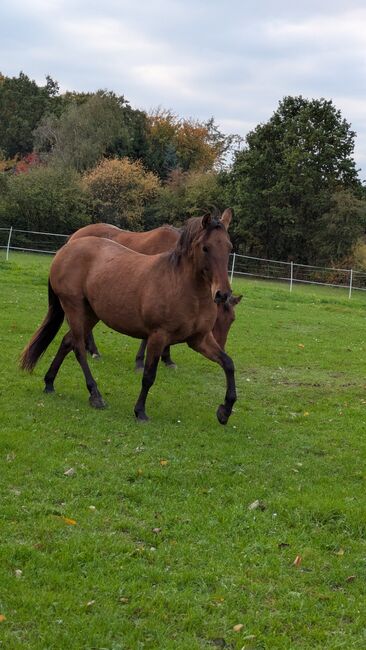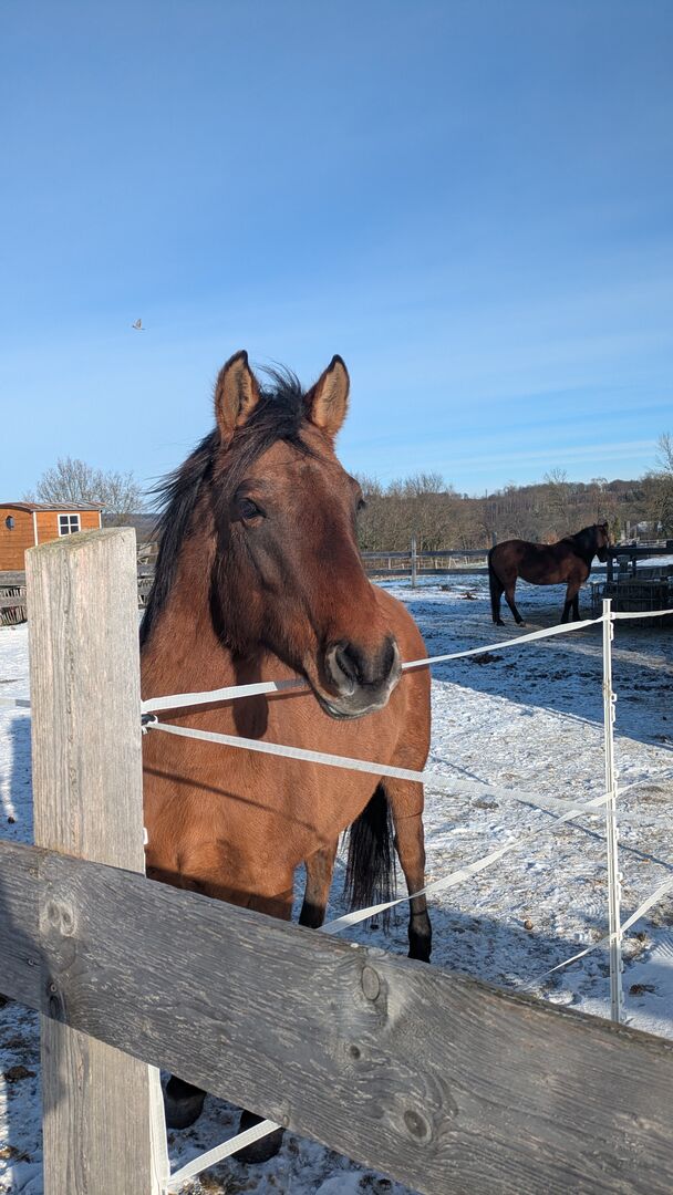 Saphira was a pasture accident, so her father is a Konik and her mother a German riding horse. She will be 6 years old at the beginning of July. She has been with us since birth and now lives with her mother and two geldings in an open stable and in the summer 24 hours a day in the pasture. Before that, she also spent some time in a stall.