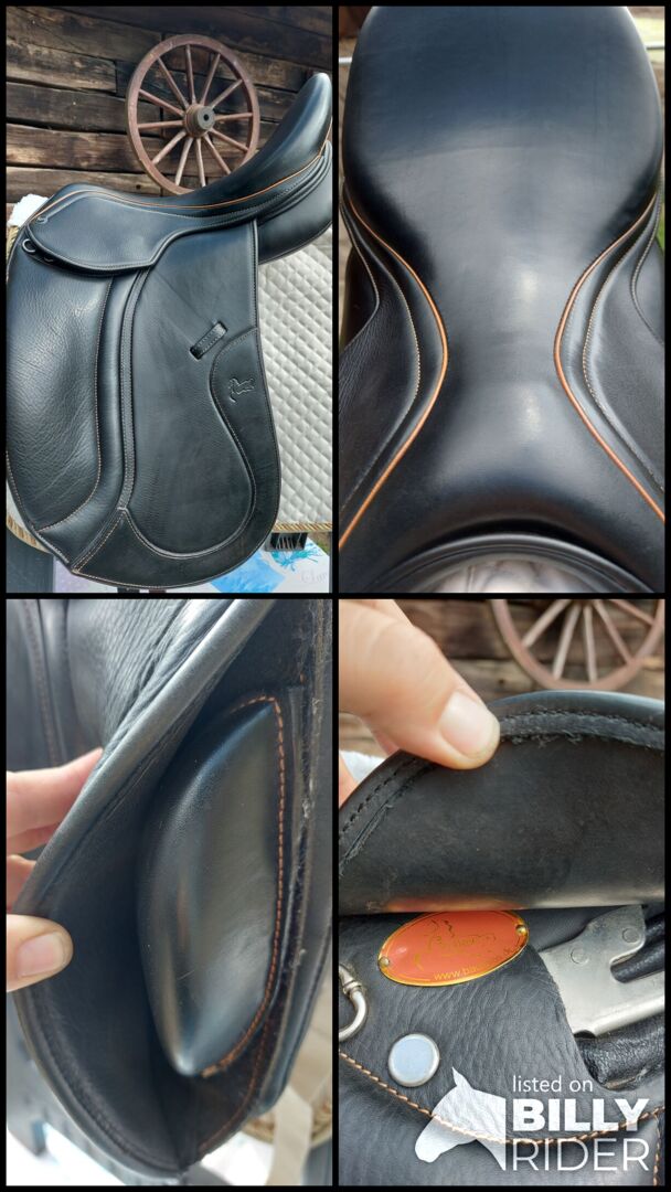 Seat: 17.5 inches Saddle flap: normal, mono flap Chamber width: medium wide - infinitely variable cold adjustment Cushion filling: wool Color: black with orange stitching Fit: very suitable for short horse backs very well adjustable Condition: very good, well-kept condition Leather: doubled calfskin Cushions: French cushions Seat: deep Girth: long girth straps Seat size 17.5 inches. The saddle is ideal for horses with a short back.