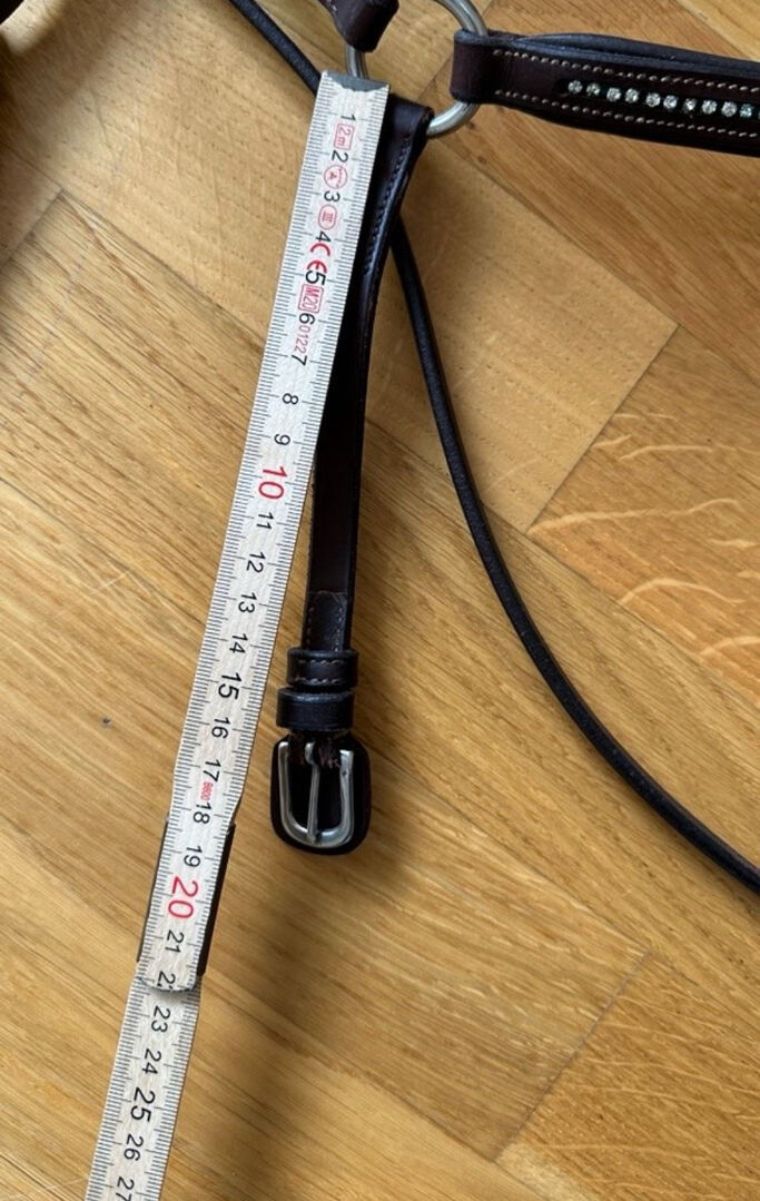 Mexican snaffle VB Brown - Dark brown mexican snaffle . I bought it myself here, unfortunately it doesn't fit my VB Arabian . It has some green fluff on the stones (see last photo) But it is almost not noticeable and the bridle is really very nice . Private sale therefore no guarantee, warranty or return. If you have any questions please contact me :)
