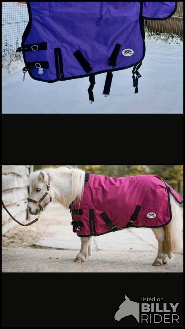 The rugs are unlined and fitted with a highneck and nylon lining. The rug was only on the shetty for a short time to try it on. Pink size 70cm Purple size 80cm Each blanket 38€ for both together 70€