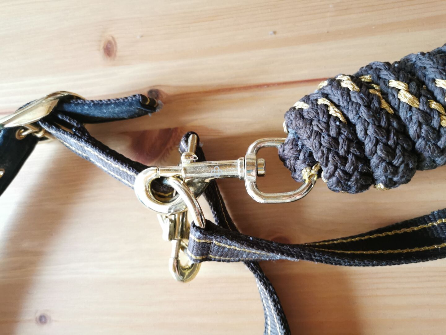 New halter and rope set - New set consisting of halter and rope. Beautiful dark brown with gold stripes and fittings.