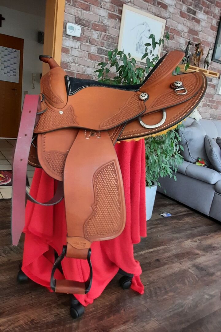 New western saddle Stone Deek - Unique opportunity, due to giving up riding !!! First class western saddle with very nice punching and great cut in the aluminum stirrups. Seat: 40cm withers width: 20cm total length: 61cm NP: 1100 € FB: 900 € plus shipping costs Whatsapp 0151-68504384 Private sale without guarantee
