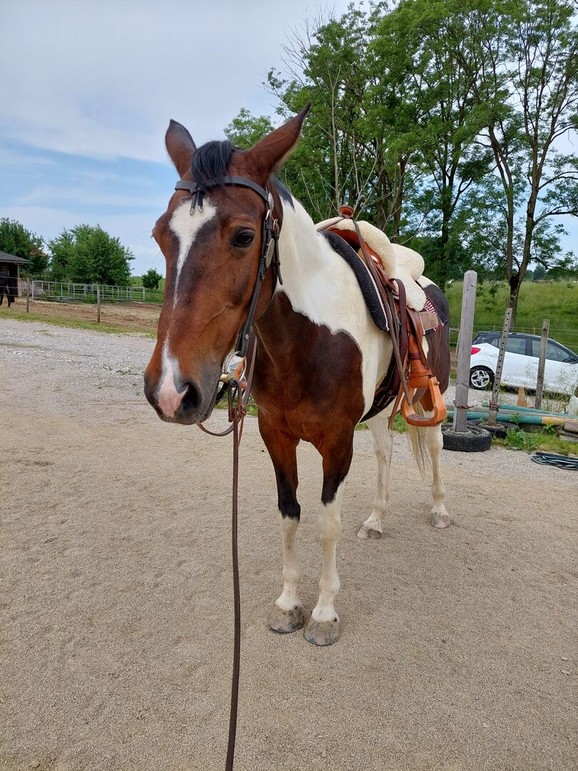 Offer riding participation on well-behaved pinto mare - I am looking for a reliable rider for my 20 year old warmblood pony mix mare. She is 152 cm tall, a pretty pinto and very well-behaved. Many things are possible with her: from ground work to leisurely rides. She is ridden recreationally, both English and western (I currently only have a western saddle and a pad for riding bareback). We are based in a small stable in Krexham (4624 Pennewang) with a riding arena and a beautiful riding area.
