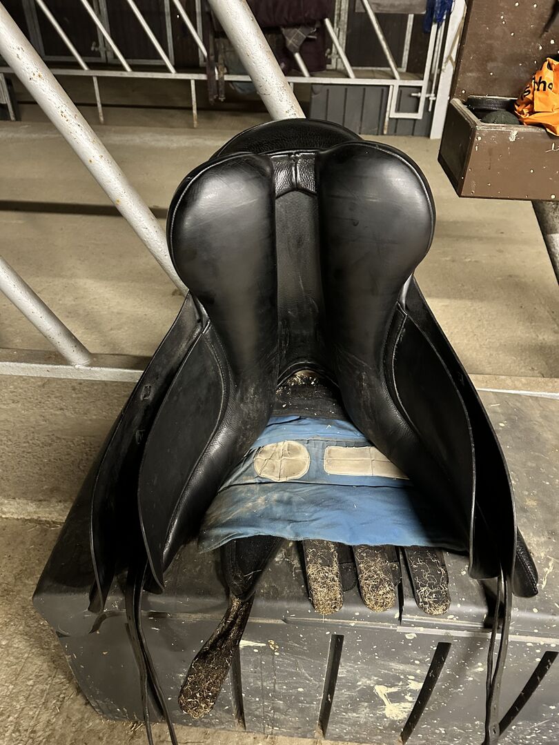 Black optimum performance 17.5 wide dressage saddle in very good condition. No rips or tears and girth straps in very good condition. The saddle provides the rider with a deep and secure seat with large moveable knee blocks for full support