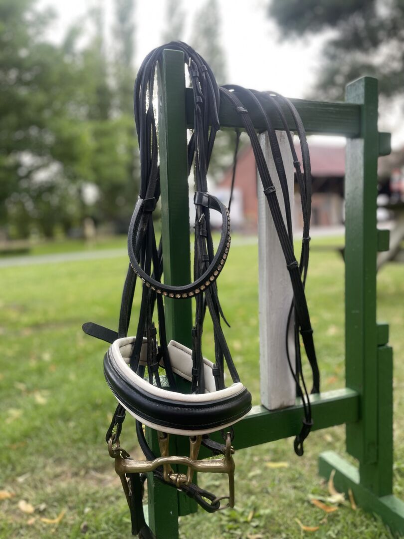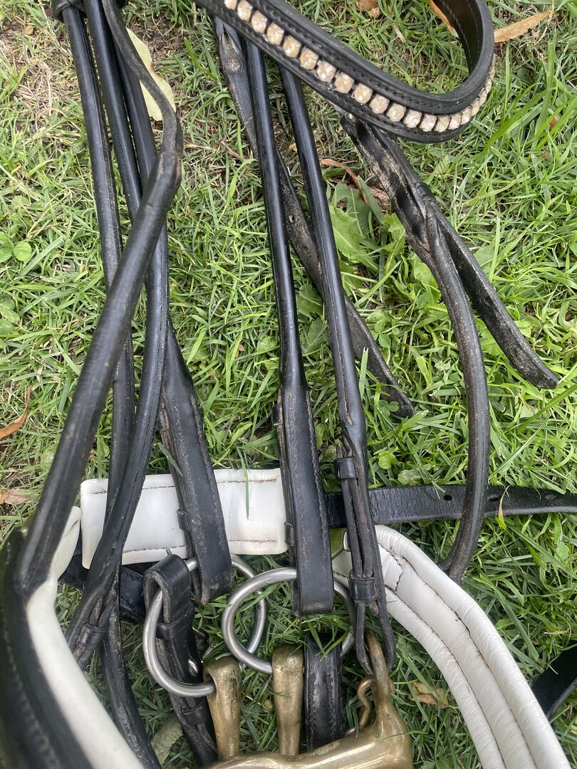 Otto Schumacher curb bit size WB round stitched - Hello, we sell a great double bridle in black from the brand Otto Schumacher with bits and reins. The curb bit has normal signs of use. The noseband is white backed. The browband has silver glitter stones. The curb bit had a very high new price. NP: approx. 850 €