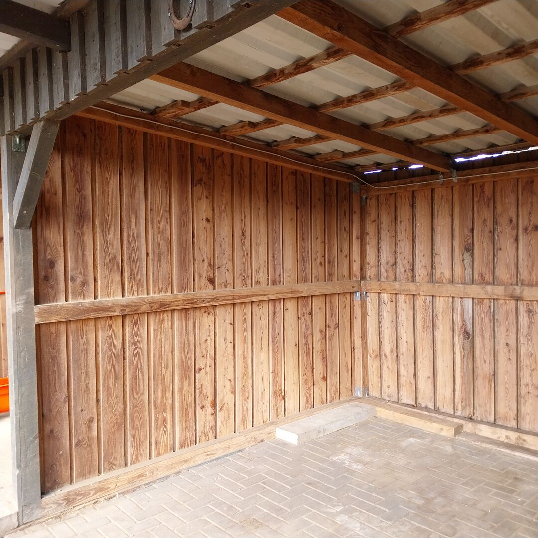 Consisting of - a closed extension (far left) measuring 3.50 m x 2.84 m (used by us as a storeroom/saddlery), light panel in the rear wall, a full-length Klönschnack door (can be changed to a two-part door at a later date)